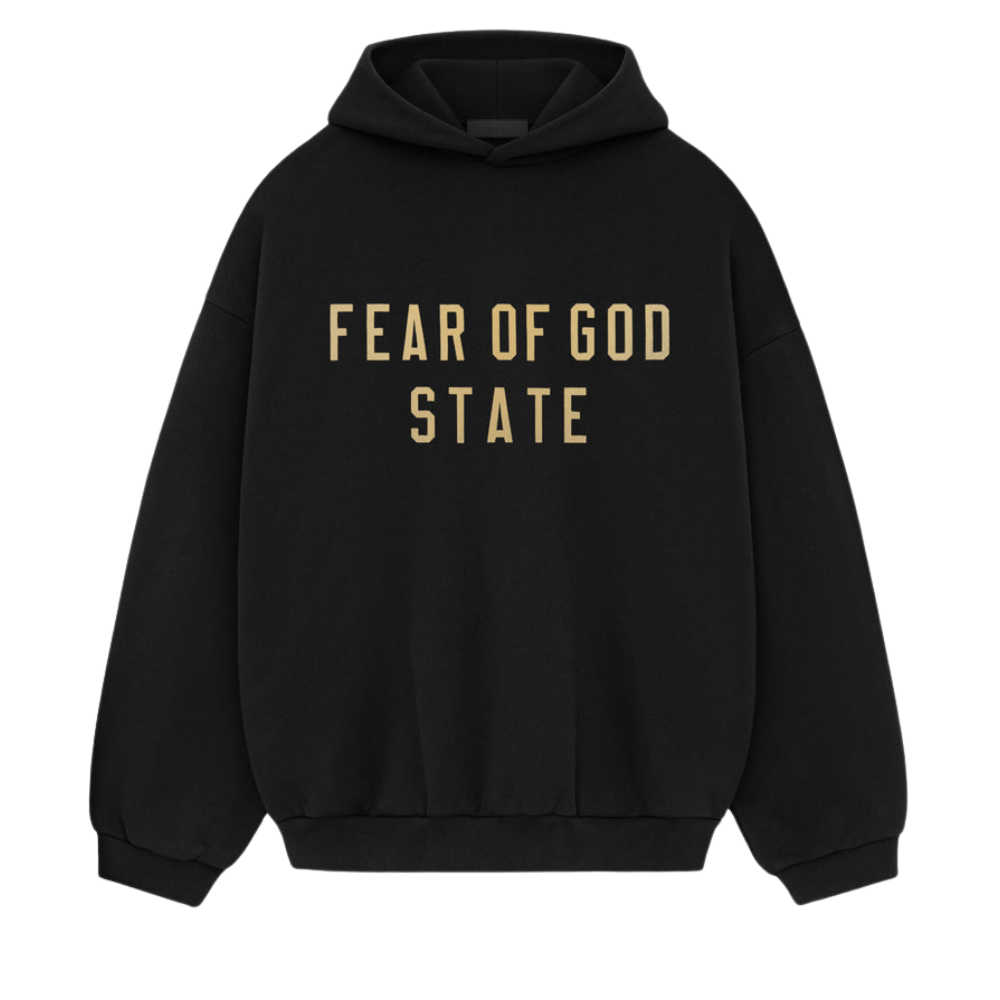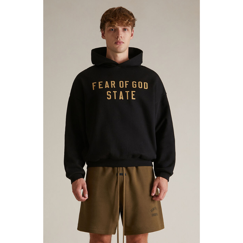 The Essentials Fleece Hoodie has been upgraded in a heavier 480gsm core fleece to provide additional body and structure. A collegiate-inspired "Fear of God State" graphic is screen printed on the front. Details include an overlapped neckline hoodie, rib-knit cuffs, waist-hem, and side pockets. The Essentials Fear of God rubberized label is at the back collar.