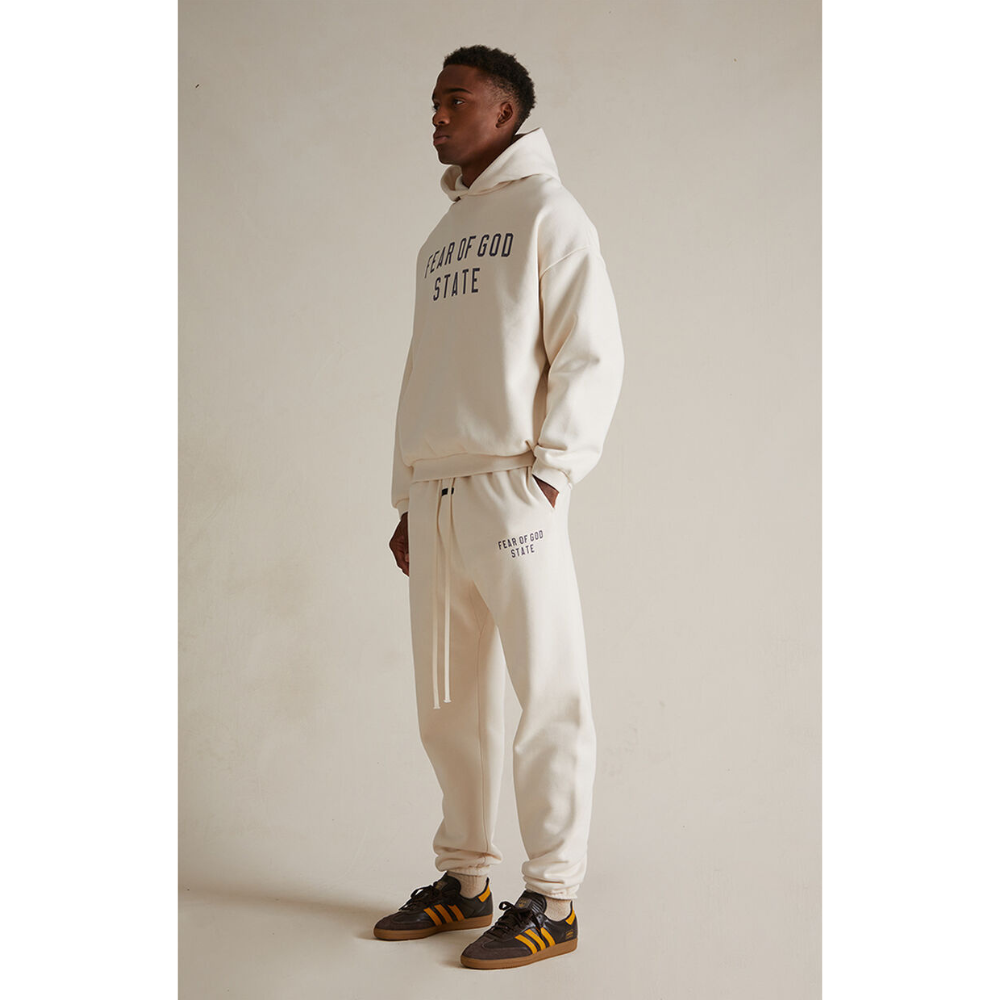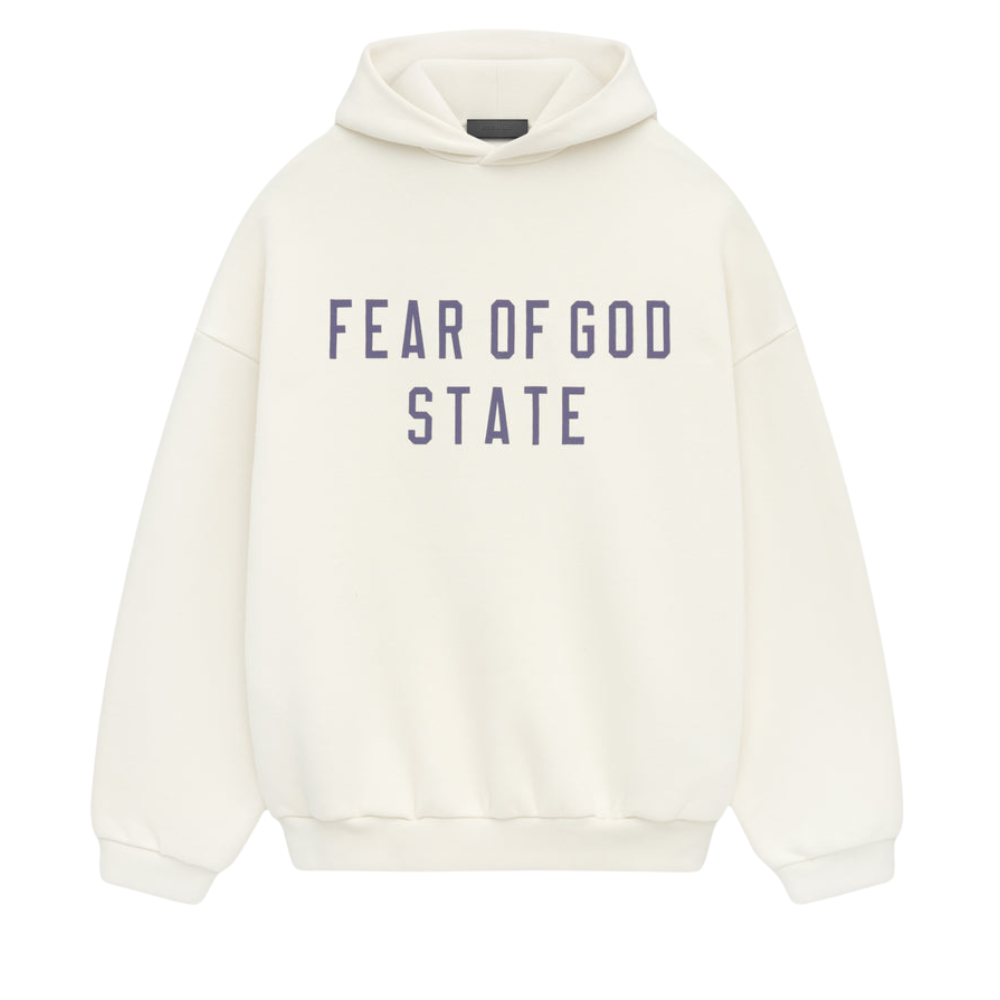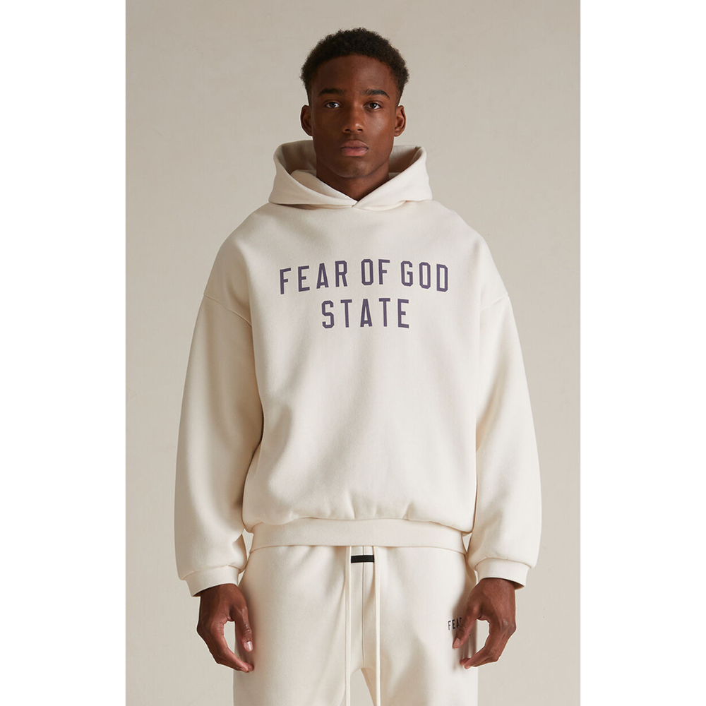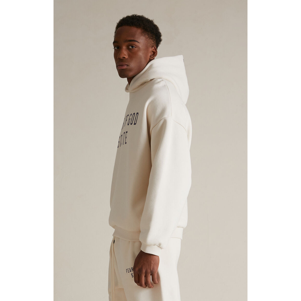 The Essentials Fleece Hoodie has been upgraded in a heavier 480gsm core fleece to provide additional body and structure. A collegiate-inspired "Fear of God Essentials" graphic is screen printed on the front. Details include an overlapped neckline hoodie, rib-knit cuffs, waist-hem, and side pockets. The Essentials Fear of God rubberized label is at the back collar.
