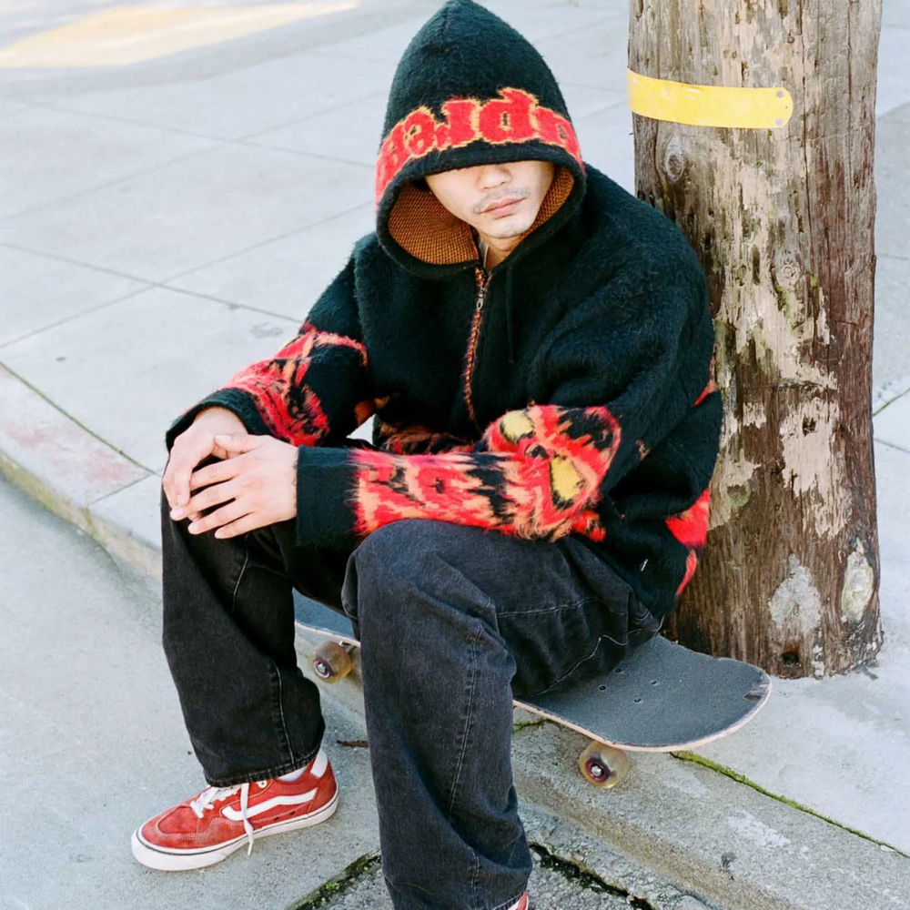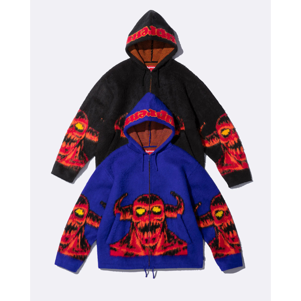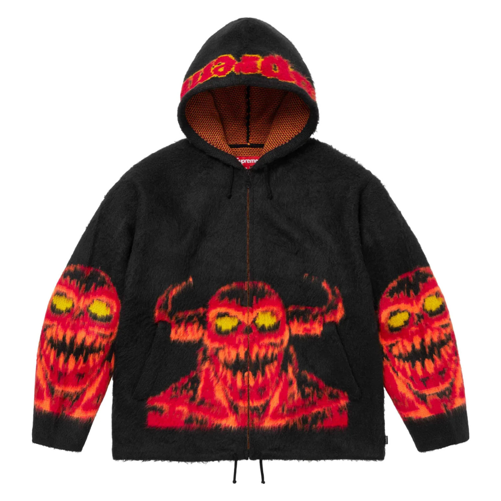 The Supreme x Toy Machine Zip-Up Hooded Sweater in black is a standout piece from the Spring/Summer 2024 (SS24) collection, blending Supreme’s iconic streetwear style with Toy Machine’s skateboarding heritage.
