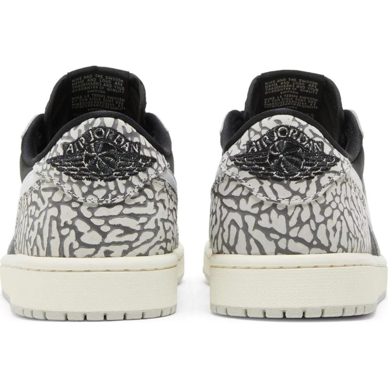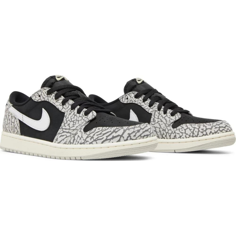 The Air Jordan 1 Retro Low OG ‘Black Cement’ borrows an instantly recognizable design motif from the iconic Air Jordan 3. Grey elephant print appears on the shoe’s forefoot and heel overlays, while the rest of the upper is constructed from smooth black nubuck. Branding elements include a white leather Swoosh, woven Nike Air tongue tags, and a retro Wings logo embroidered on the heel tab. The low-top is mounted on a vintage off-white midsole, supported underfoot by a durable grey rubber outsole.
