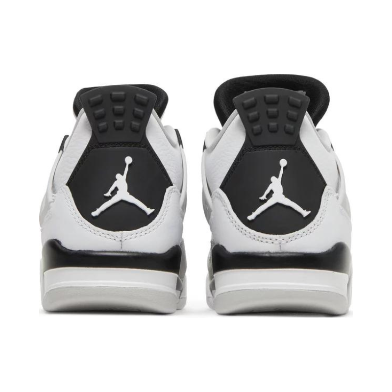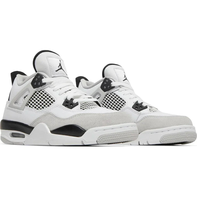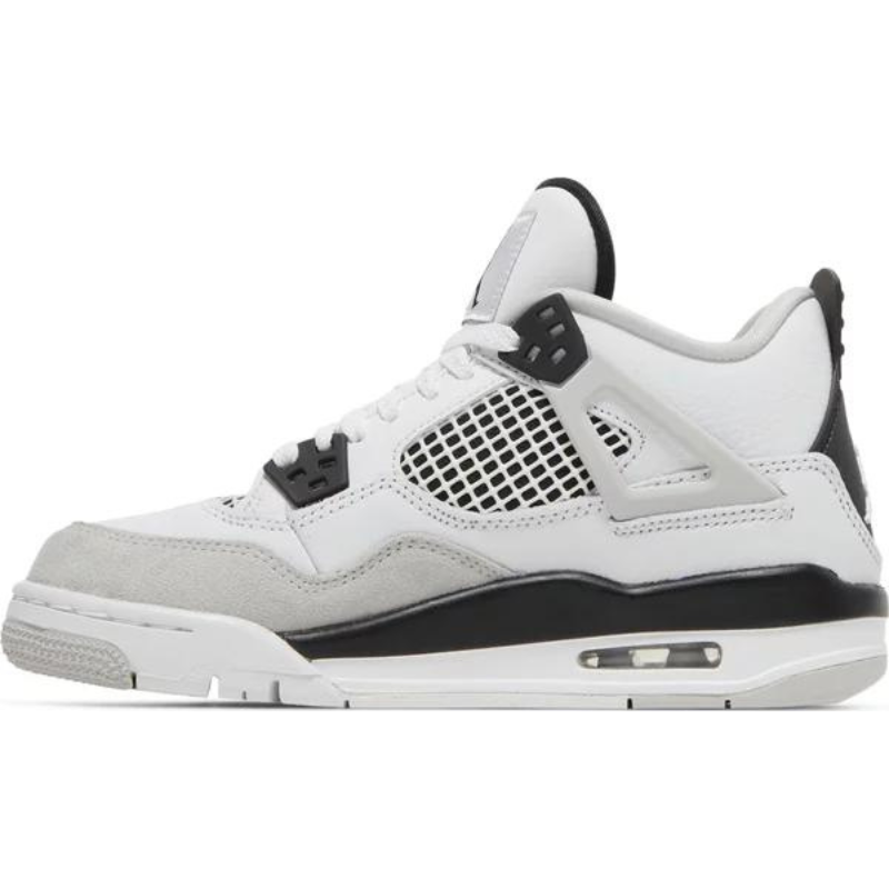 Pulling its color-blocked style from the Air Jordan 4 Military Blue, the Air Jordan 4 Military Black features a smooth white leather upper with a light grey Durabuck toe wrap and netted TPU inserts. Military Black eyelets, heel tabs, and underlays add a stark contrast to the upper. At the base, a white, black, and light grey sole with a visible Air unit completes the design.