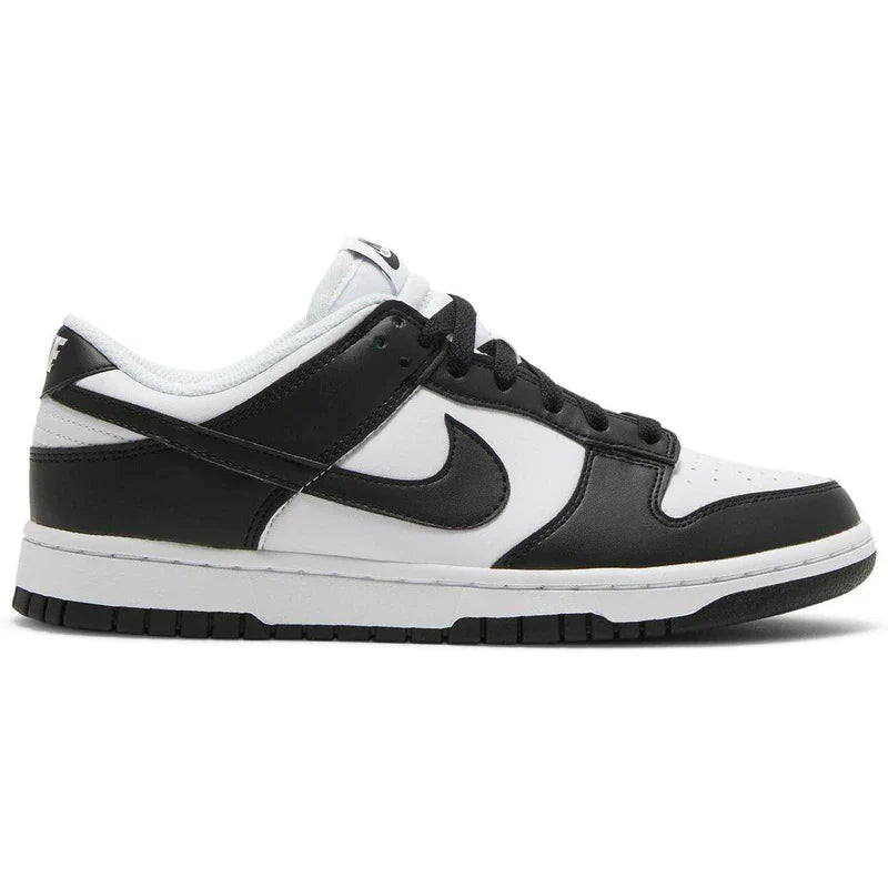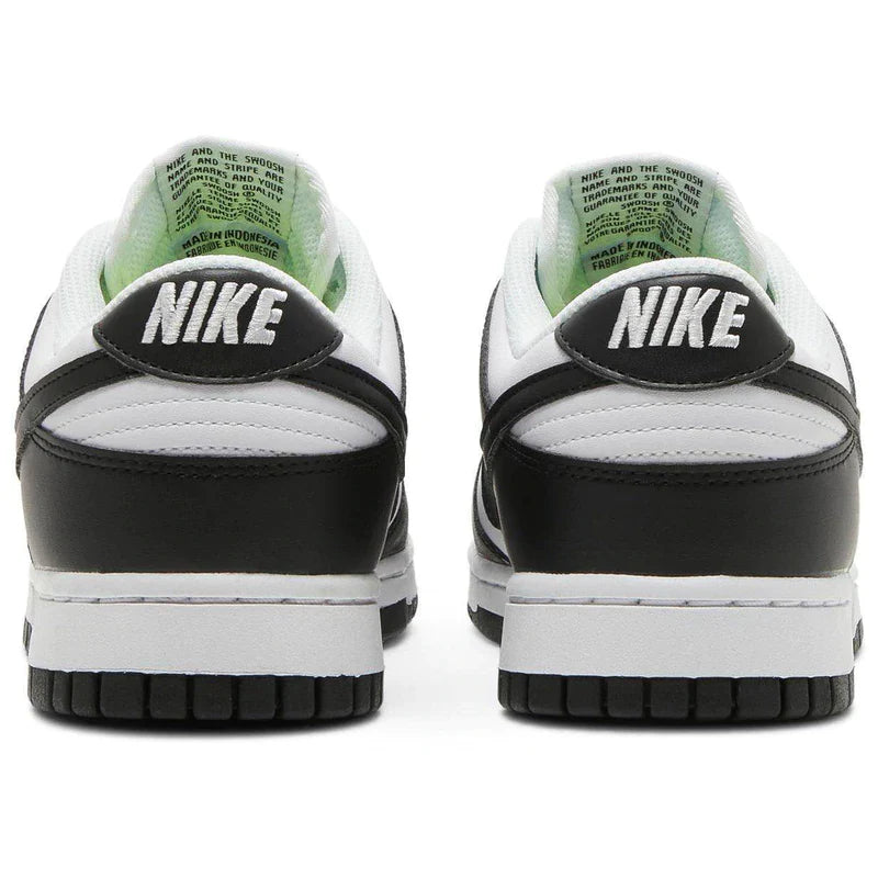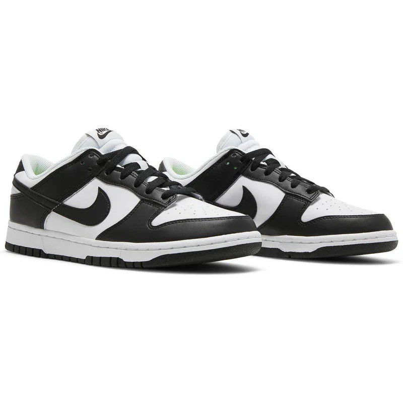 The Nike women’s Dunk Low Next Nature ‘Panda’ gives the essential two-tone colorway a refreshed build incorporating at least 20% recycled content by weight. The synthetic leather upper pairs a clean white base with contrasting black overlays. Standard branding elements include a woven Nike tongue tag and an embroidered Nike wordmark on the heel tab. A contrasting pop of color appears on the sockliner, rendered in a neon green finish and accented with Nike’s pinwheel logo. The low-top is mounted on a durable rubber cupsole, featuring white sidewalls and a black rubber outsole.