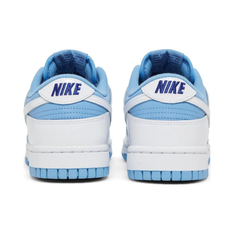The Nike Dunk Low Reverse UNC (Women) has a bright blue sole matched with a white midsole. The majority of the shoe is made out of leather.