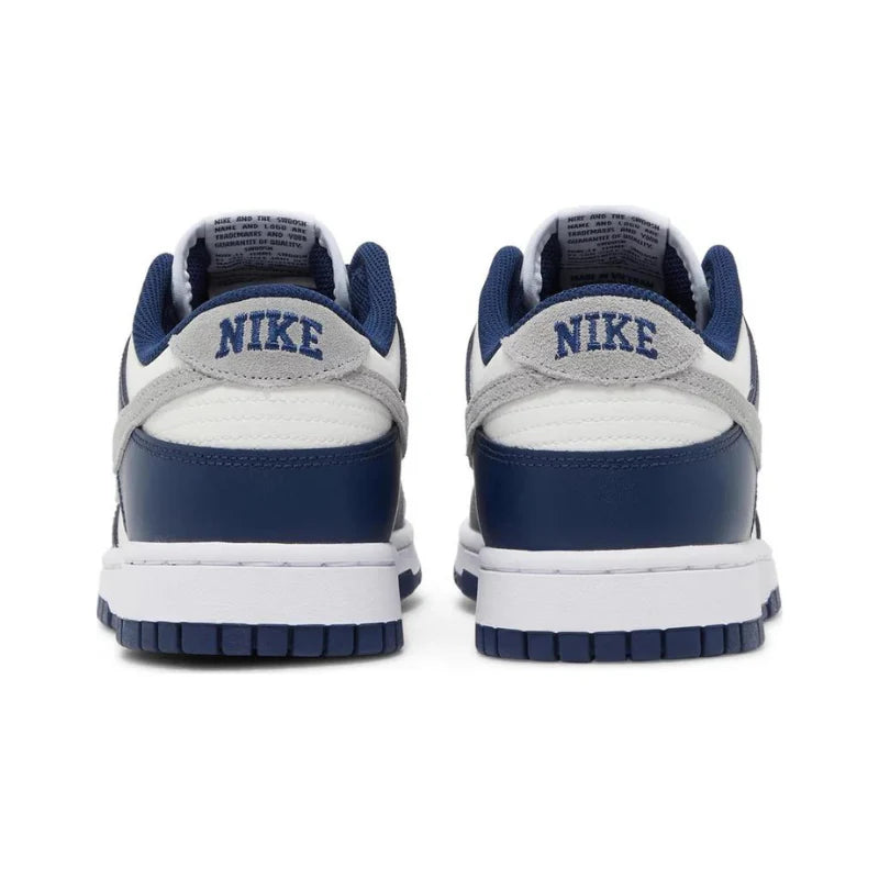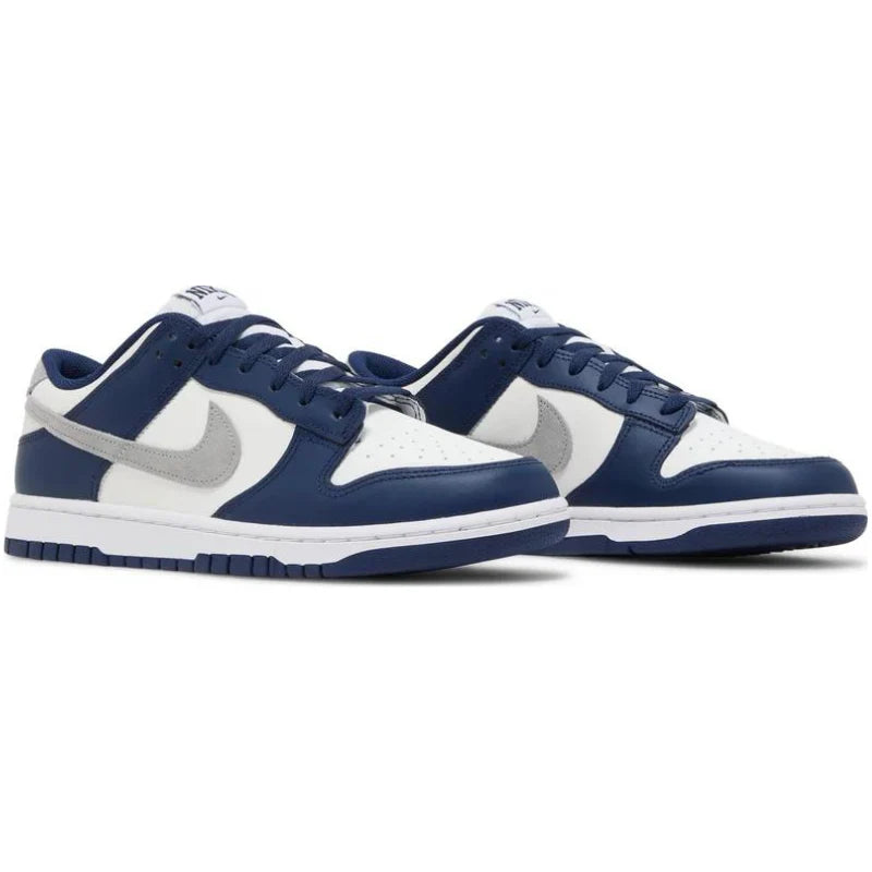 Taking on an official color combination of Midnight Navy/White-Neutral Grey, this Nike Dunk Low starts off with a White/Sail tumbled leather construction on the base of the upper which is then joined by Midnight Navy on the leather overlays, laces, inner liner, rubber outsoles, and the new Nike branding on the tongues. As a finishing touch we see grey suede Swooshes on the side panels and a white rubber midsole.