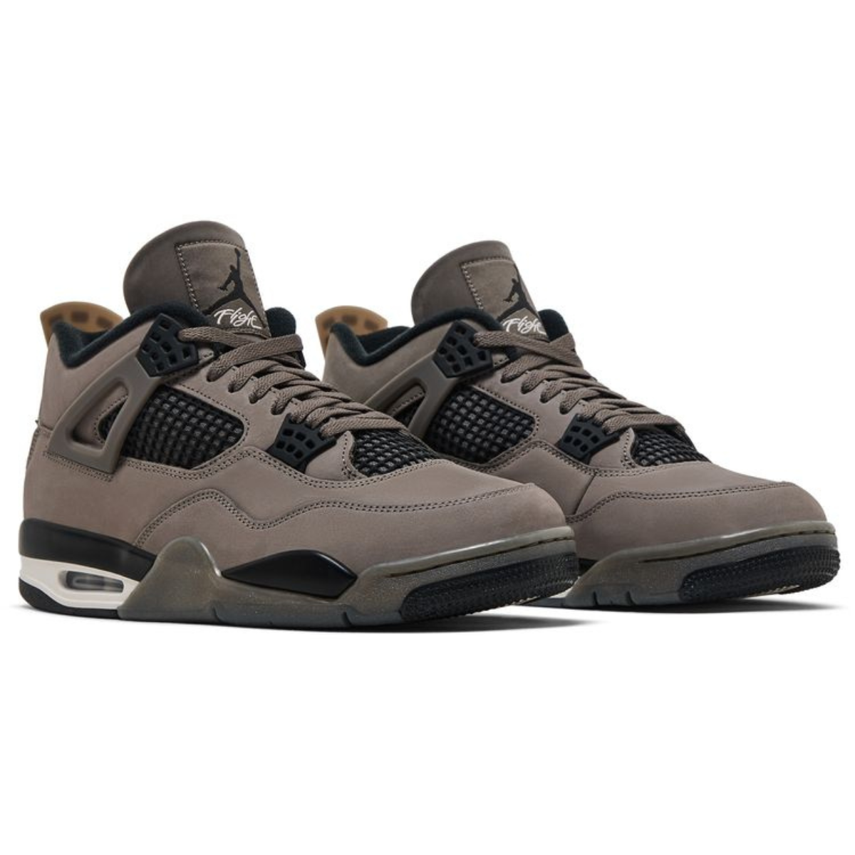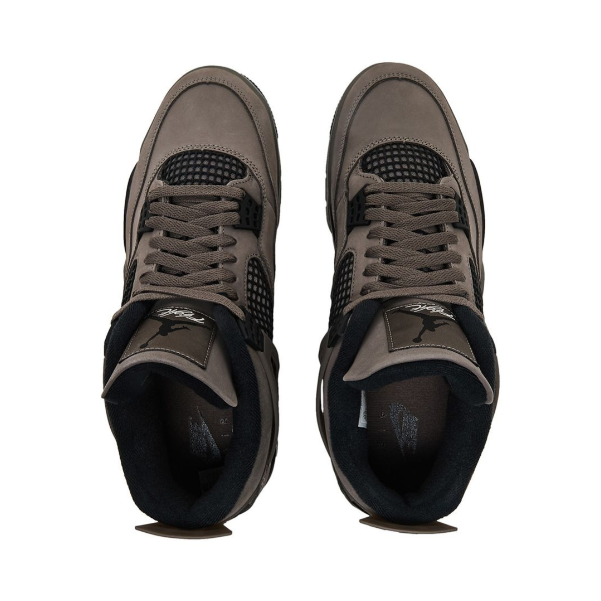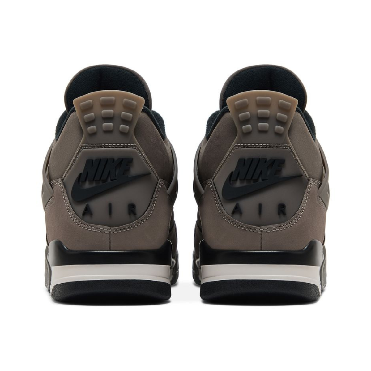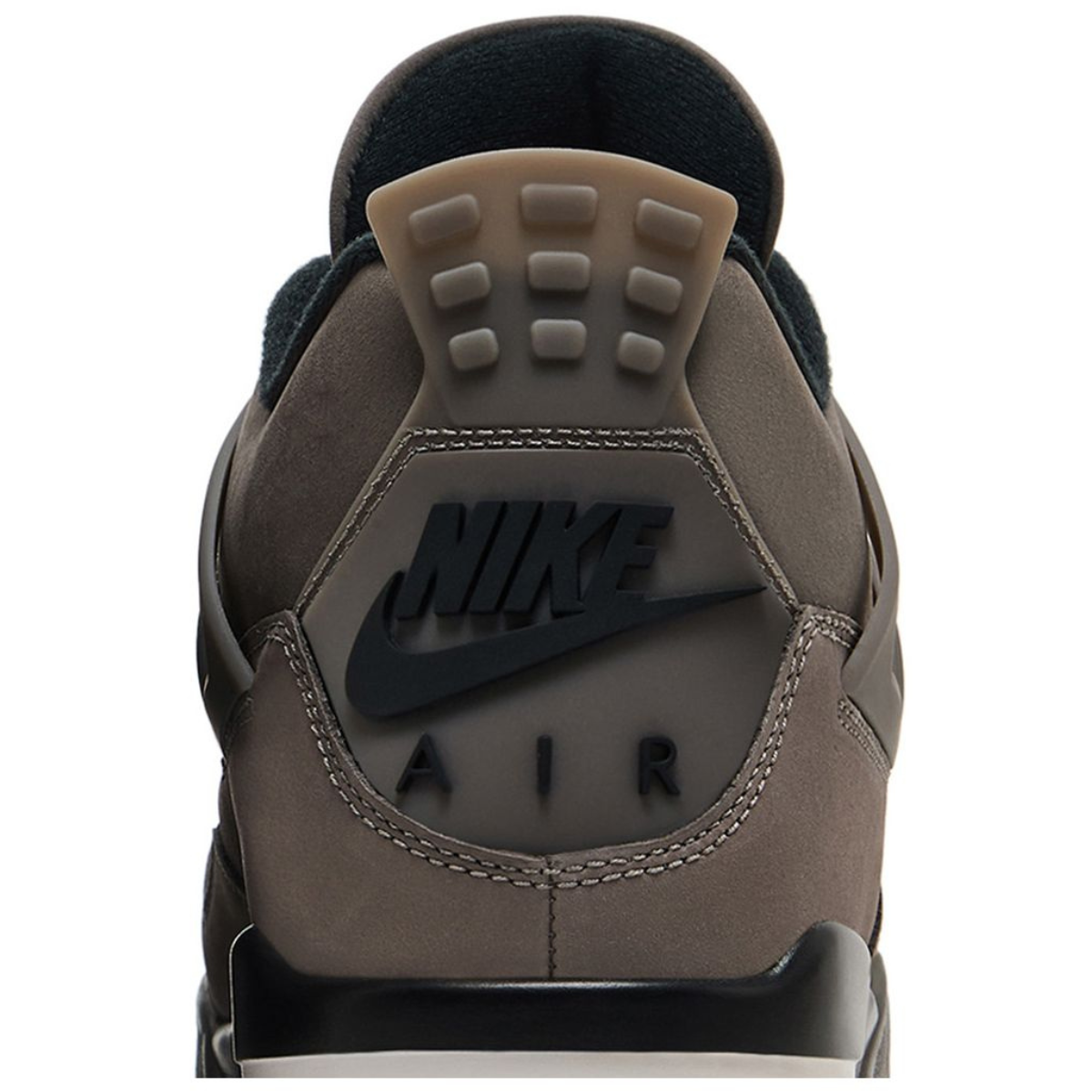 The Air Jordan 4 Retro 'Cave Stone' showcases a dark taupe hue on the smooth nubuck upper, featuring contrasting black accents on the quarter panel netting, molded eyelets, and textile collar lining. A Jumpman icon adorns the woven Flight tongue tag, while Nike Air branding graces the molded heel tab. Lightweight cushioning is provided by a white and black polyurethane midsole with visible Air-sole cushioning in the