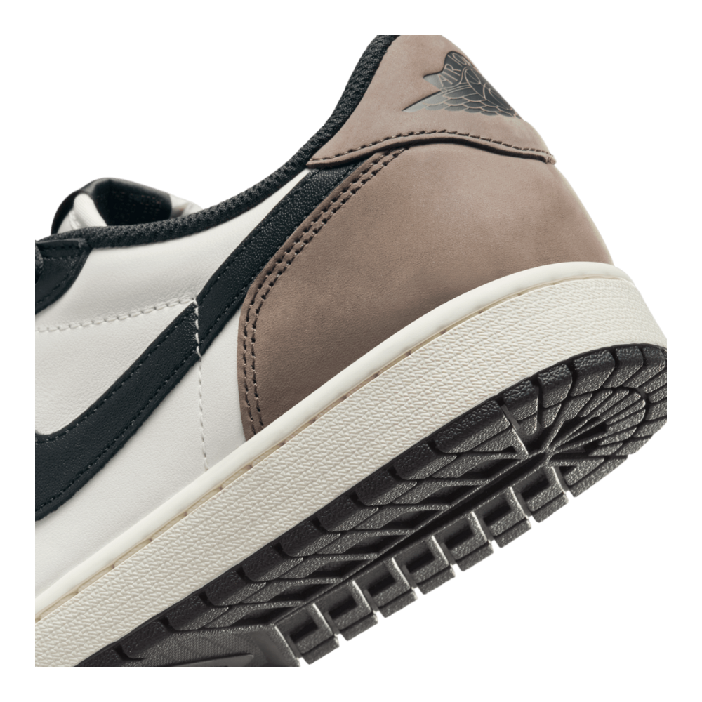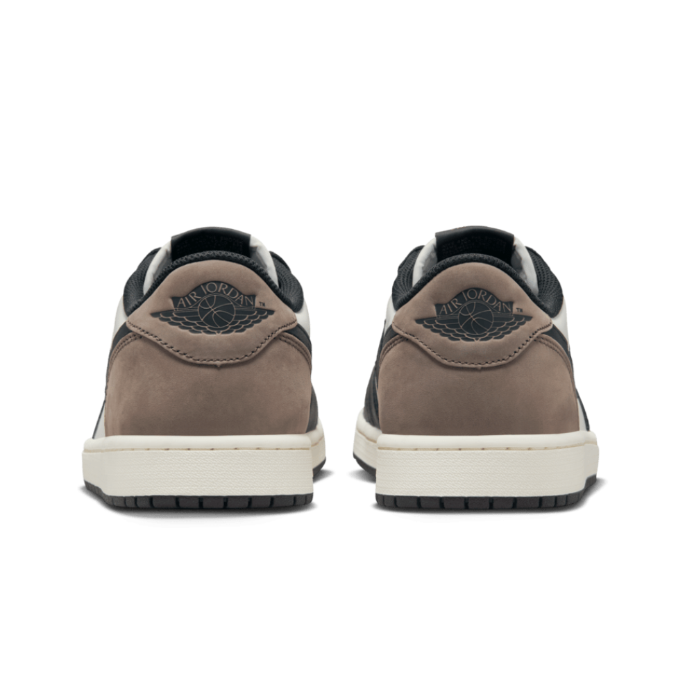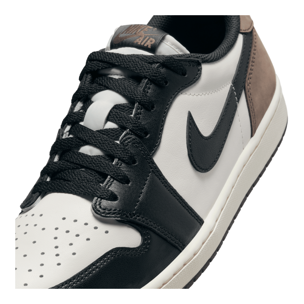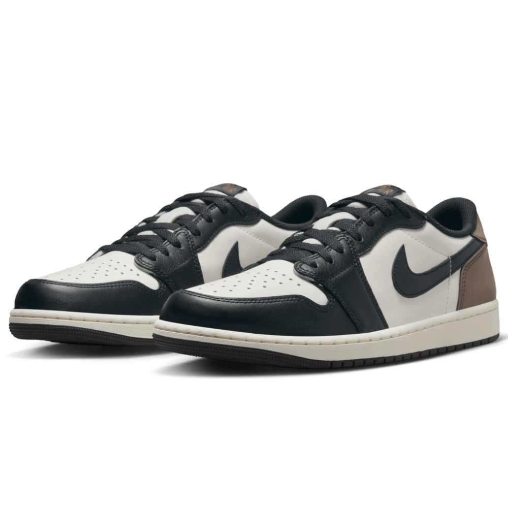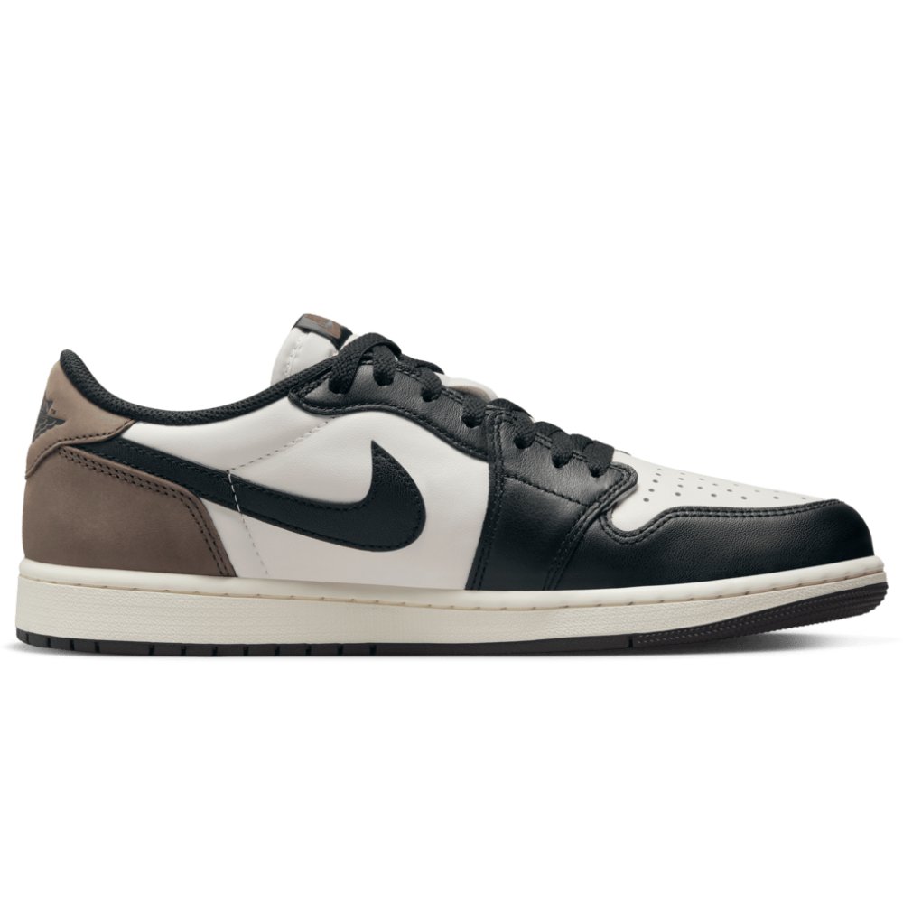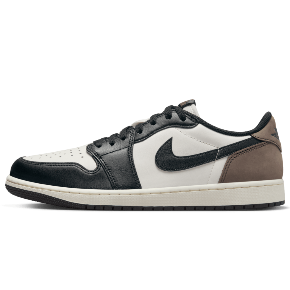 The Air Jordan 1 Retro Low OG 'Mocha' features a white leather upper with contrasting black accents on the forefoot overlay and Swoosh. Brown nubuck wraps the heel overlay and back tab, marked with a Wings logo in black. Nike Air branding embellishes the woven tongue tag and sockliner. A subtle off-white finish coats the midsole, fitted with encapsulated Air-sole cushioning and supported by a black rubber outsole.