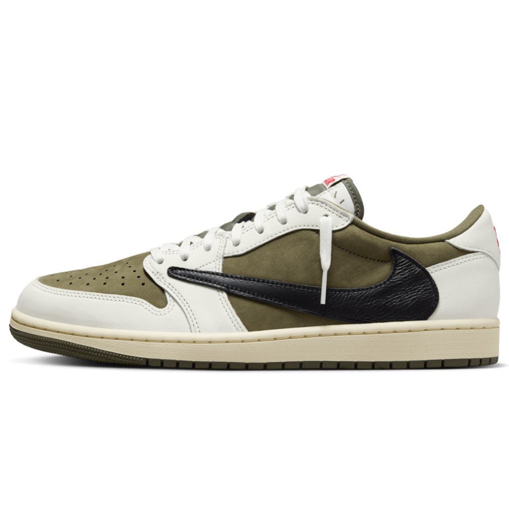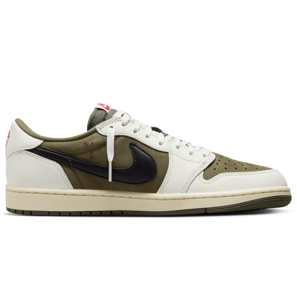 The Travis Scott x Air Jordan 1 Retro Low OG SP 'Reverse Olive / Medium Olive' combines an olive green suede base with chalk white leather overlays at the forefoot and heel. On the lateral side, Scott's signature reverse Swoosh is rendered in black tumbled leather. Crimson accents land on the Nike Air tongue tag, as well as leather back tabs marked with mismatched Jordan Wings and Cactus Jack branding. The low-top is mounted on a vintage off-white midsole, reinforced underfoot by a grippy olive rubber outsole.