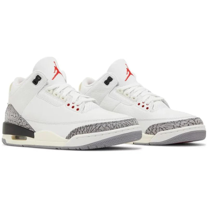 The Air Jordan 3 Retro 'White Cement Reimagined' brings back one of the original colorways, celebrating the 35th anniversary of the AJ3. Designed by Tinker Hatfield, the Reimagined iteration is built to the original 1988 specs. Returning true to form, the white leather upper pairs with elephant print overlays on the heel and toe while hits of Varsity Red appear on the lace loops and the Jumpman logo on the tongue. Nike Air is emblazoned on the back heel tab, while a visible Air unit provides lightweight cushioning. A slight hint of yellowing appears on the back heel and midsole, giving the shoe a vintage look.