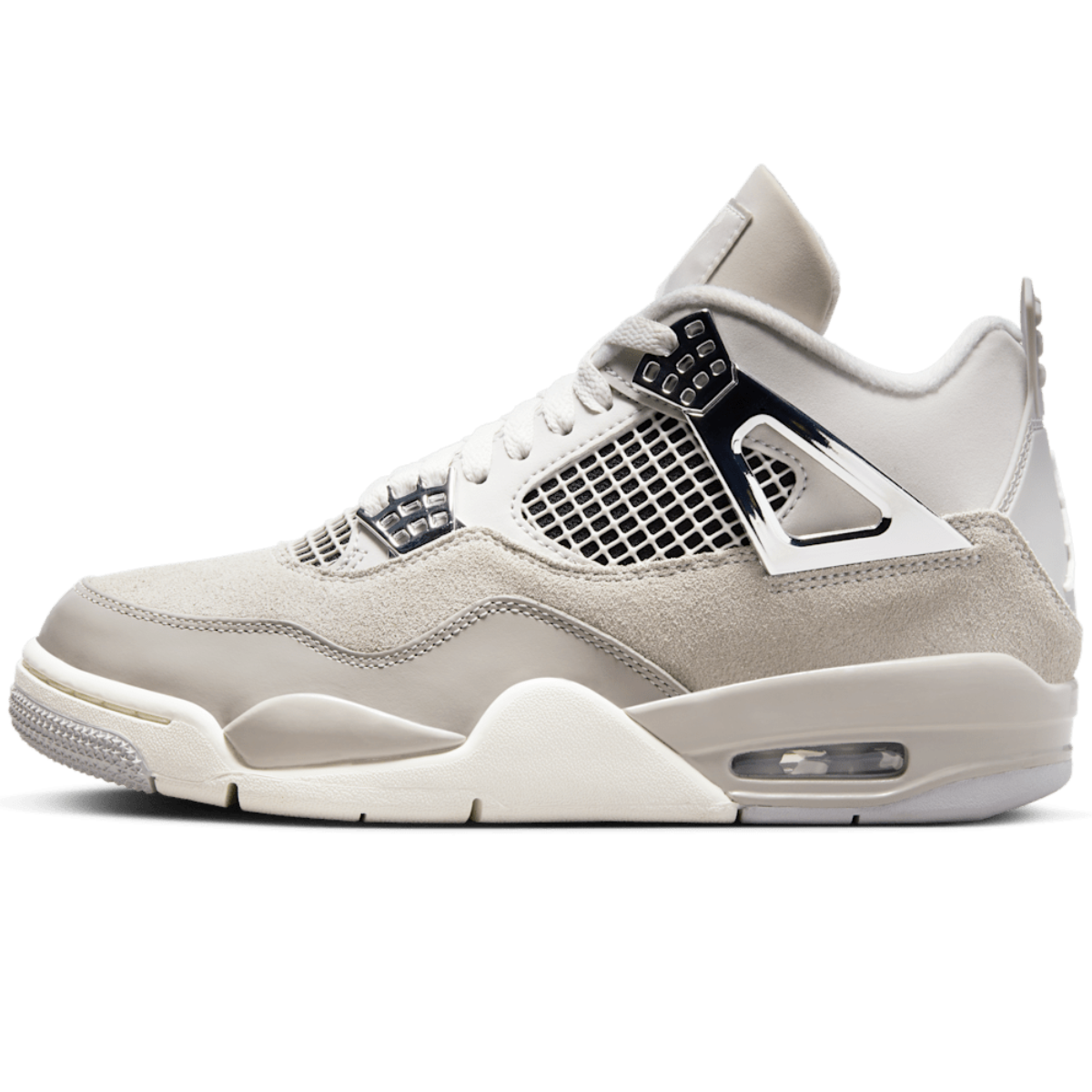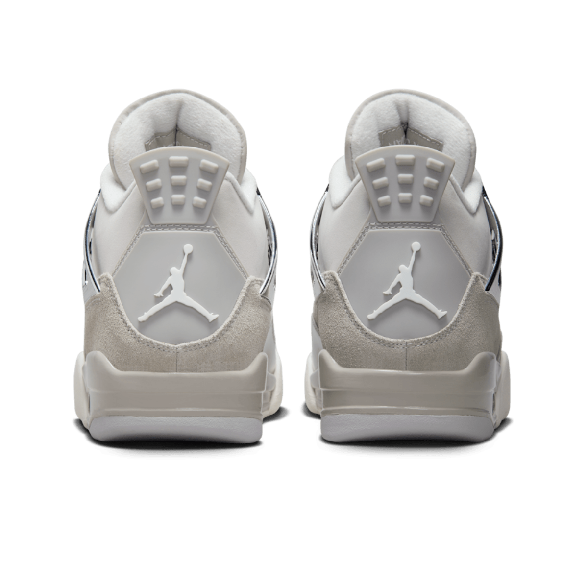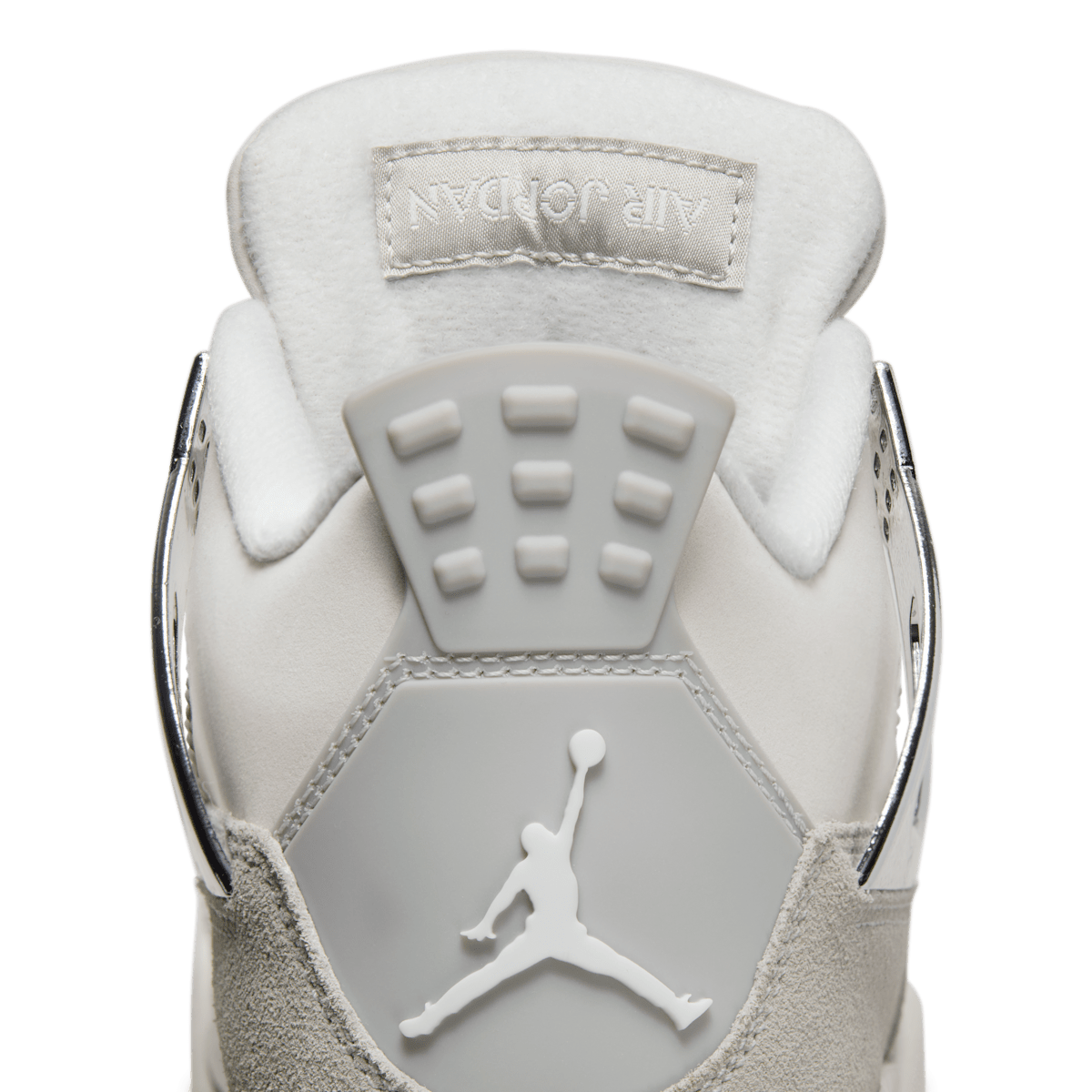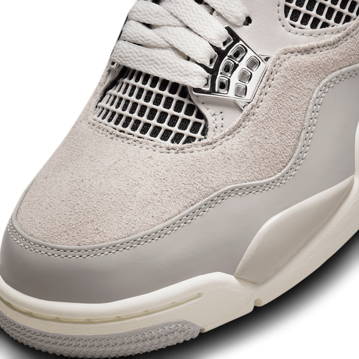 The Women’s Air Jordan 4 Retro ‘Frozen Moments’ features a pale grey suede upper with a color-matched forefoot overlay in glossy leather. Breathable netting is utilized on the throat and quarter panel, while the shoe’s molded eyelets and support wings shine in a metallic silver finish. Tonal Jumpman branding embellishes the tongue and molded heel tab. Anchoring the sneaker is a grey foam midsole with visible Air-sole cushioning in the heel.