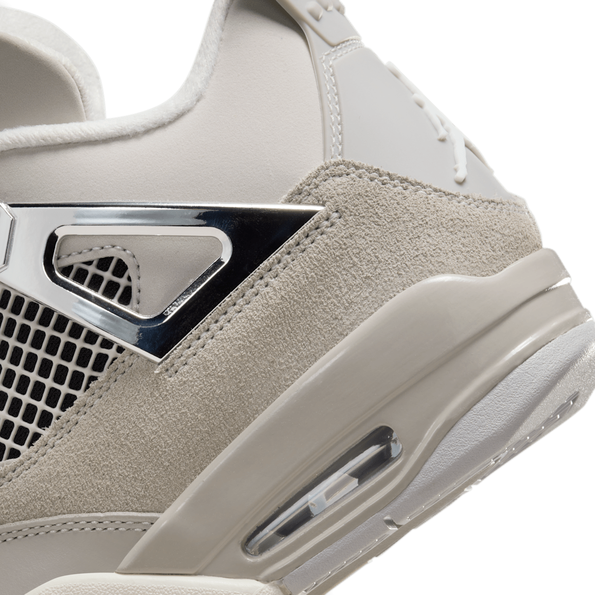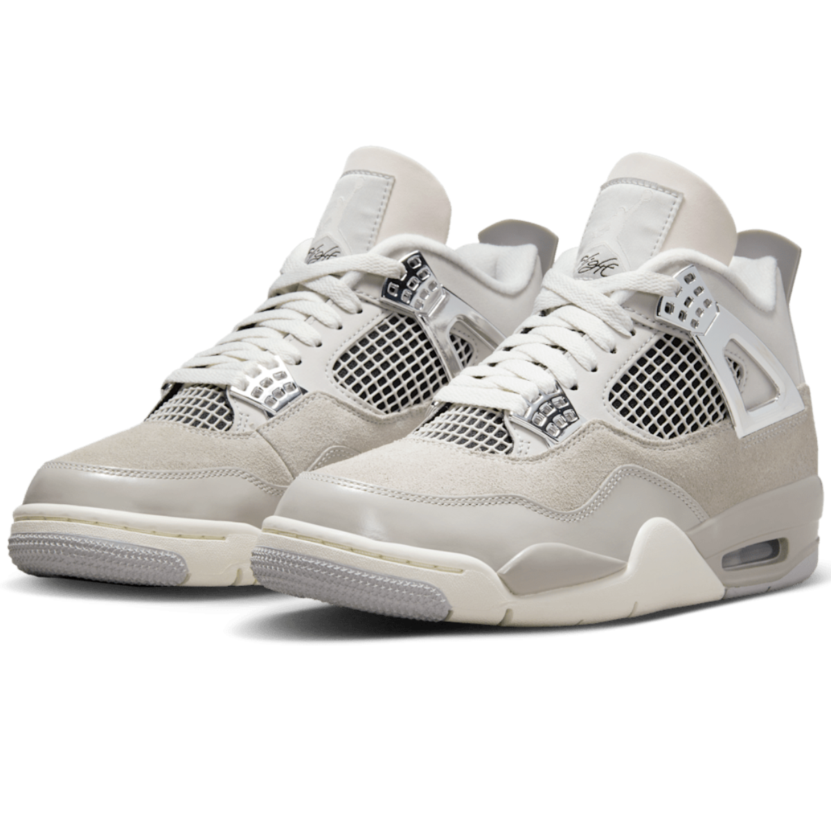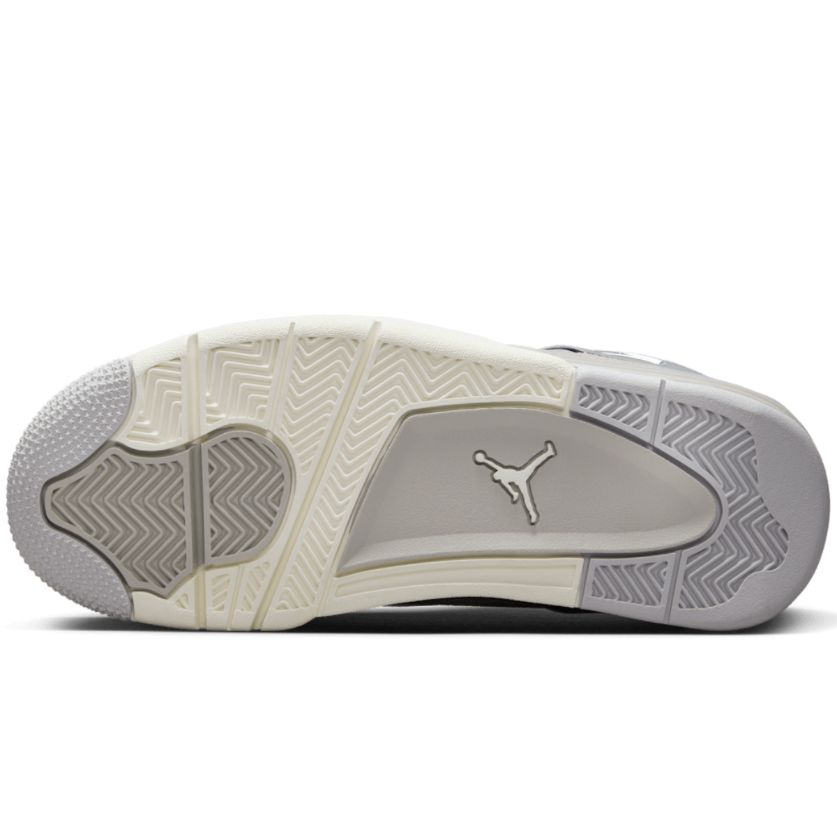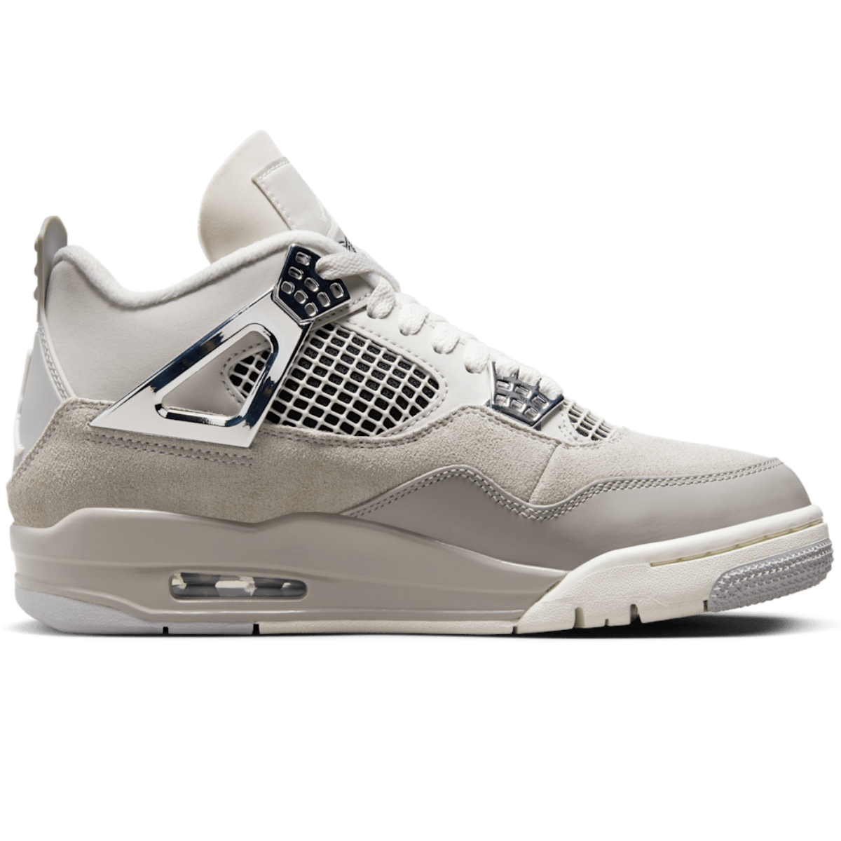 The Women’s Air Jordan 4 Retro ‘Frozen Moments’ features a pale grey suede upper with a color-matched forefoot overlay in glossy leather. Breathable netting is utilized on the throat and quarter panel, while the shoe’s molded eyelets and support wings shine in a metallic silver finish. Tonal Jumpman branding embellishes the tongue and molded heel tab. Anchoring the sneaker is a grey foam midsole with visible Air-sole cushioning in the heel.