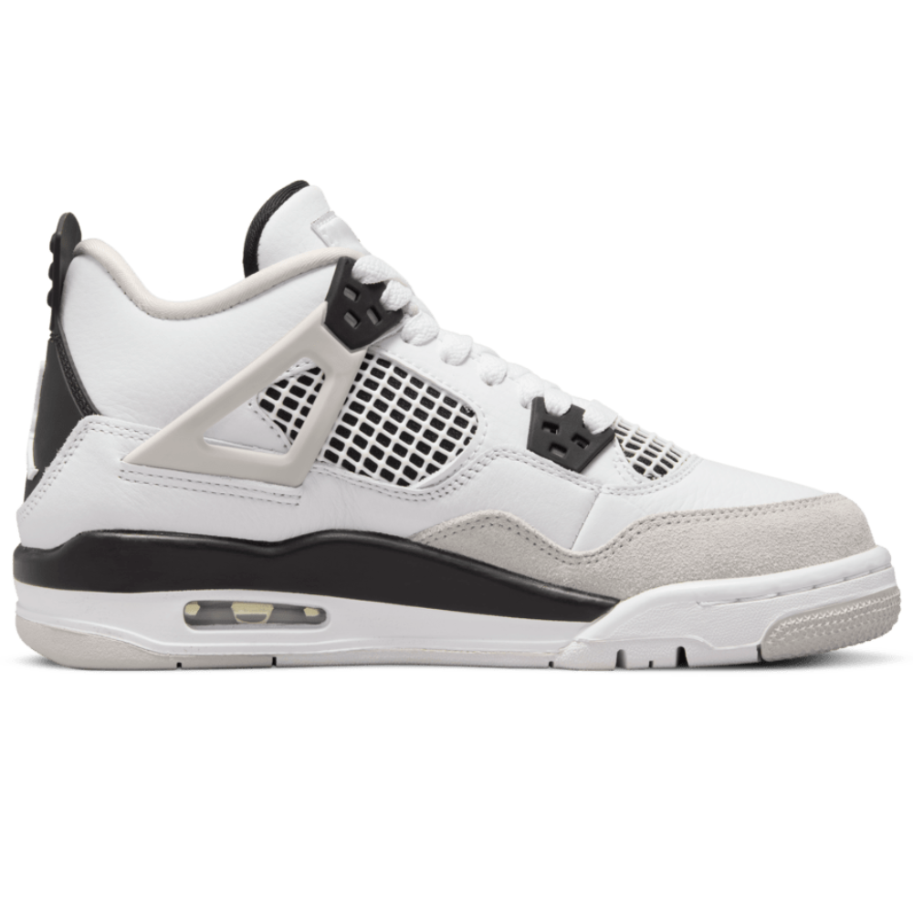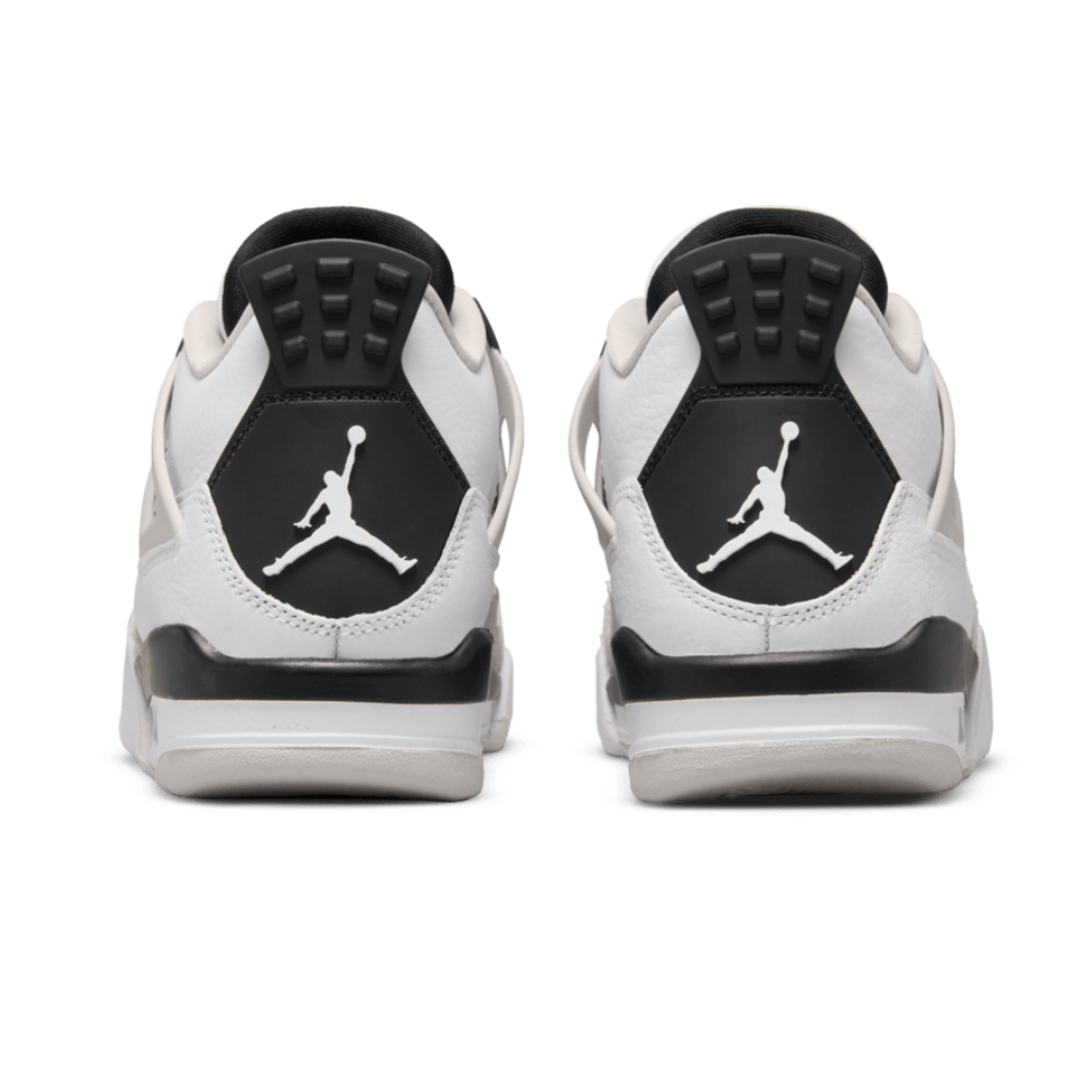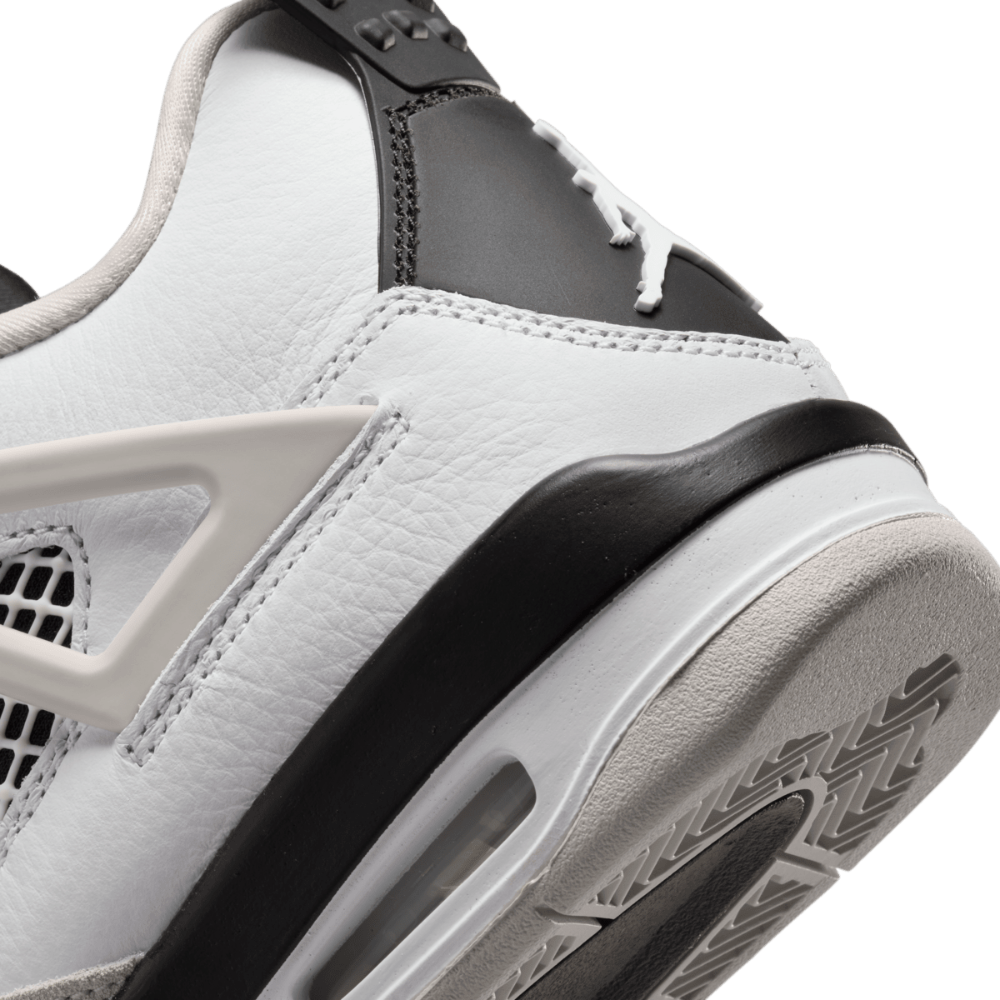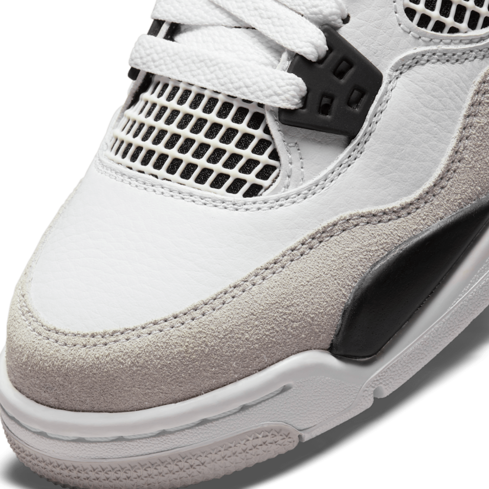 Pulling its color-blocked style from the Air Jordan 4 Military Blue, the Air Jordan 4 Military Black features a smooth white leather upper with a light grey Durabuck toe wrap and netted TPU inserts. Military Black eyelets, heel tabs, and underlays add a stark contrast to the upper. At the base, a white, black, and light grey sole with a visible Air unit completes the design.
