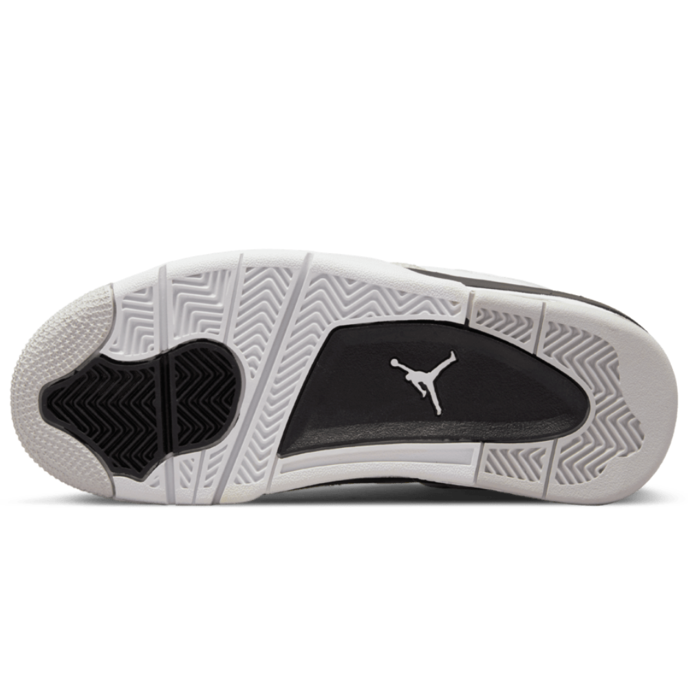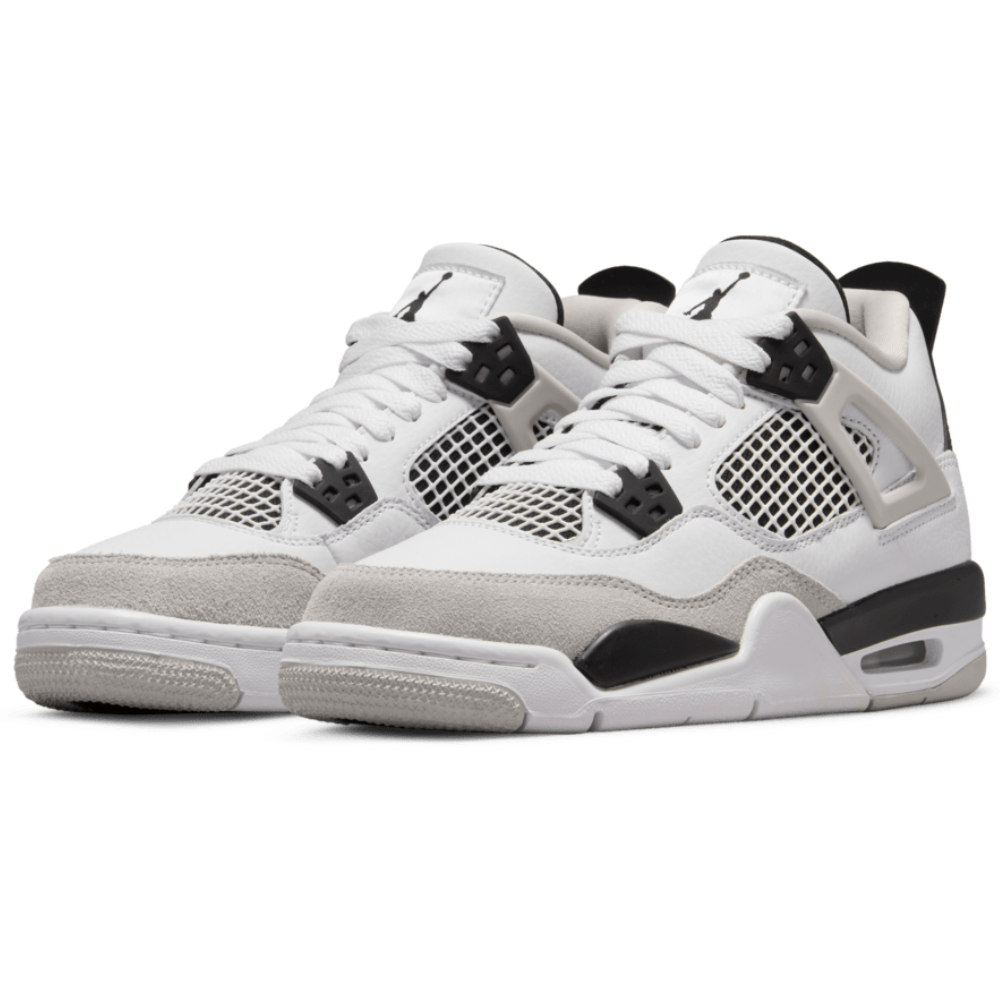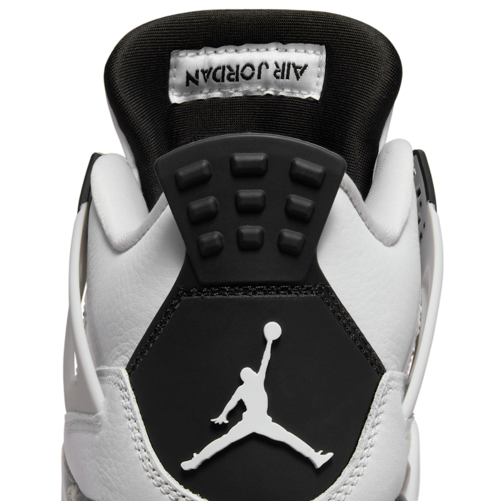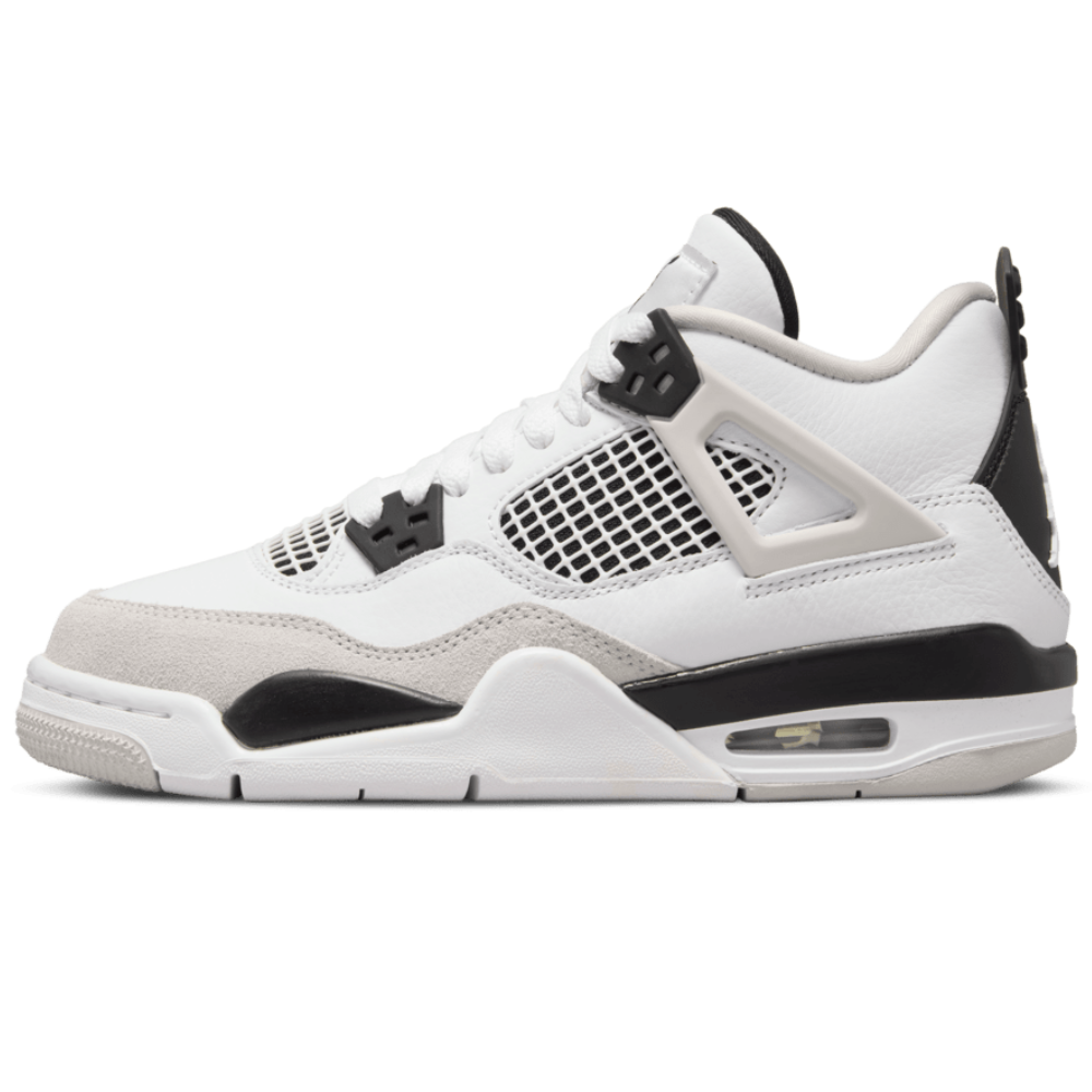 Pulling its color-blocked style from the Air Jordan 4 Military Blue, the Air Jordan 4 Military Black features a smooth white leather upper with a light grey Durabuck toe wrap and netted TPU inserts. Military Black eyelets, heel tabs, and underlays add a stark contrast to the upper. At the base, a white, black, and light grey sole with a visible Air unit completes the design.