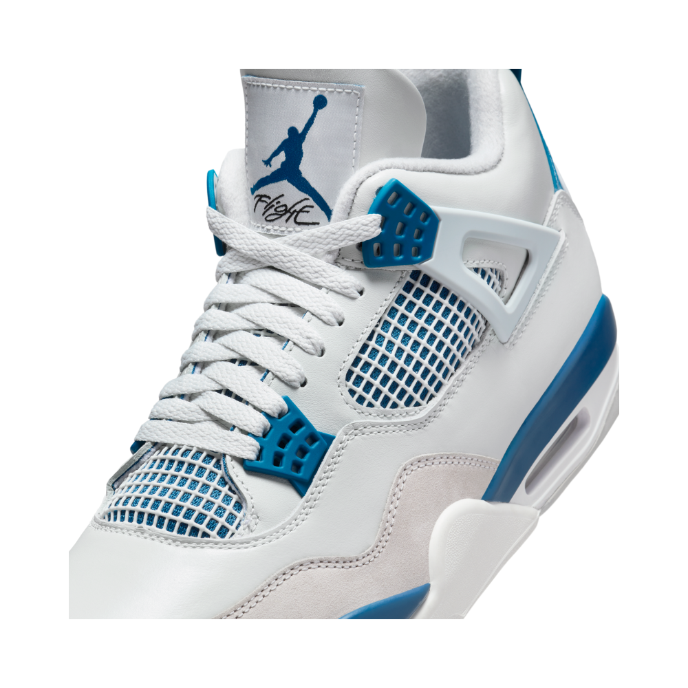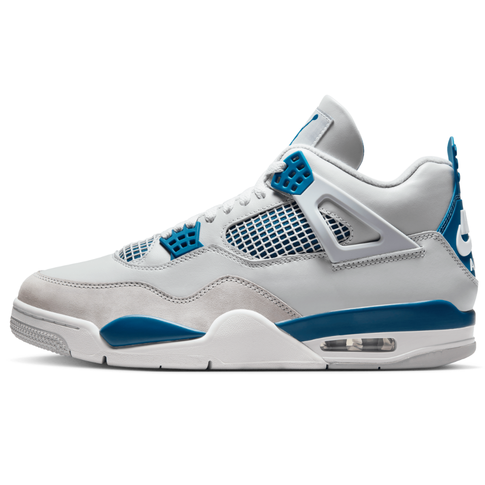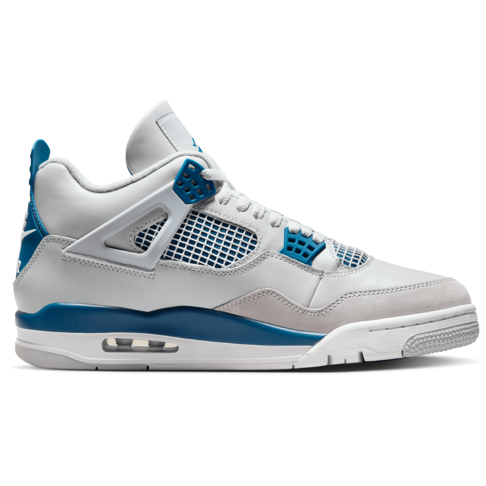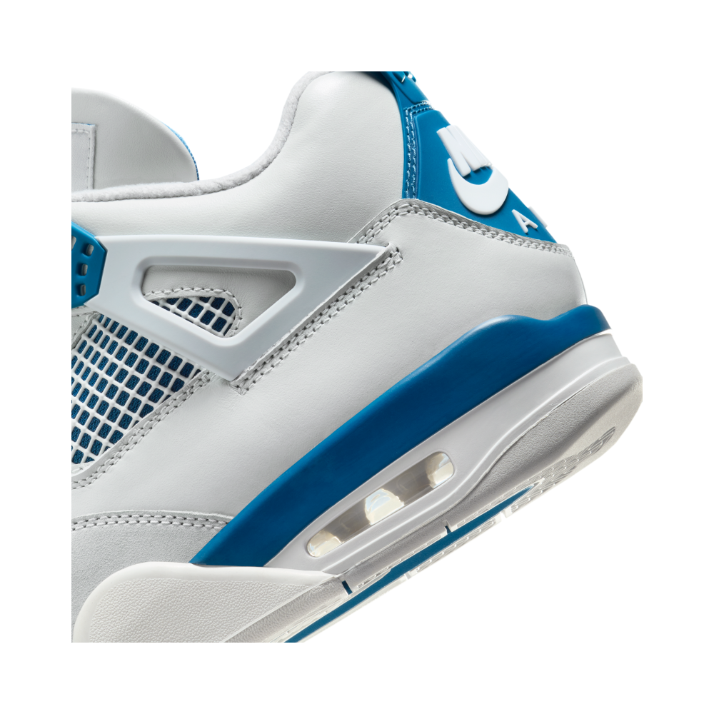 The 2024 edition of the Air Jordan 4 Retro ‘Military Blue’ also known as 'Industrial Blue' brings back a coveted OG colorway of the legacy silhouette. Smooth off-white leather is utilized on the upper, featuring quarter panel netting and a tonal nubuck forefoot overlay. A vibrant blue Jumpman logo adorns the woven tongue tag, matching the molded eyelets and a back tab marked with Nike Air branding. The sneaker rides on a lightweight polyurethane midsole with encapsulated Air-sole cushioning in the forefoot and a visible Air bag in the heel.