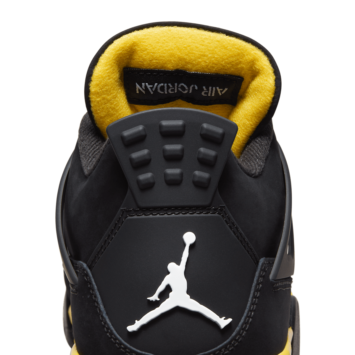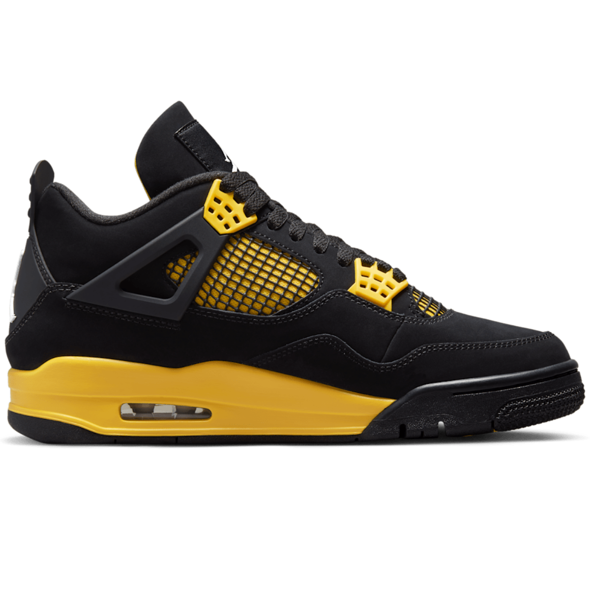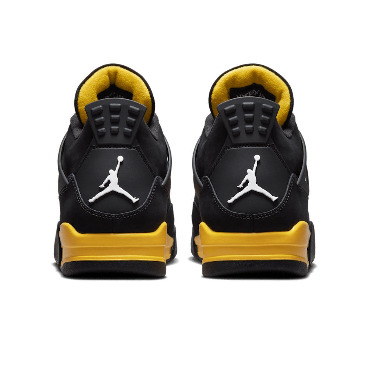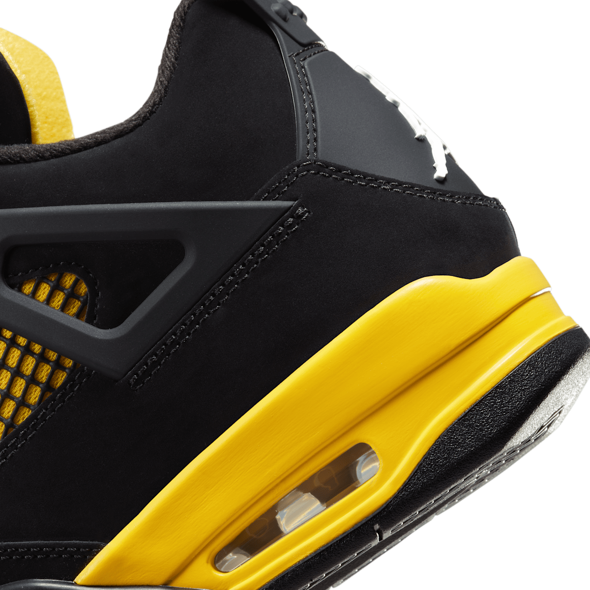 The 2023 edition of the Air Jordan 4 Retro ‘Thunder’ brings back the coveted colorway originally released in 2006 (and previously reissued in 2012). The upper is draped in smooth black nubuck, contrasted by hits of yellow on the molded eyelets, quarter panel, and lower tongue, with the latter two components covered in black netting. Jumpman branding appears on the Flight tongue tag and molded heel tab. Lightweight cushioning comes courtesy of a yellow polyurethane midsole, enhanced with an exposed Air-sole unit in the heel.