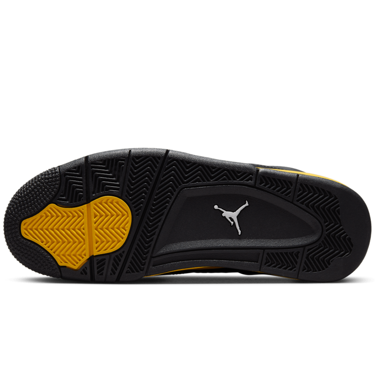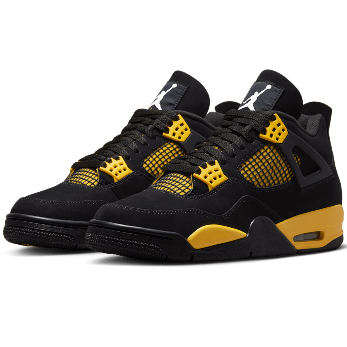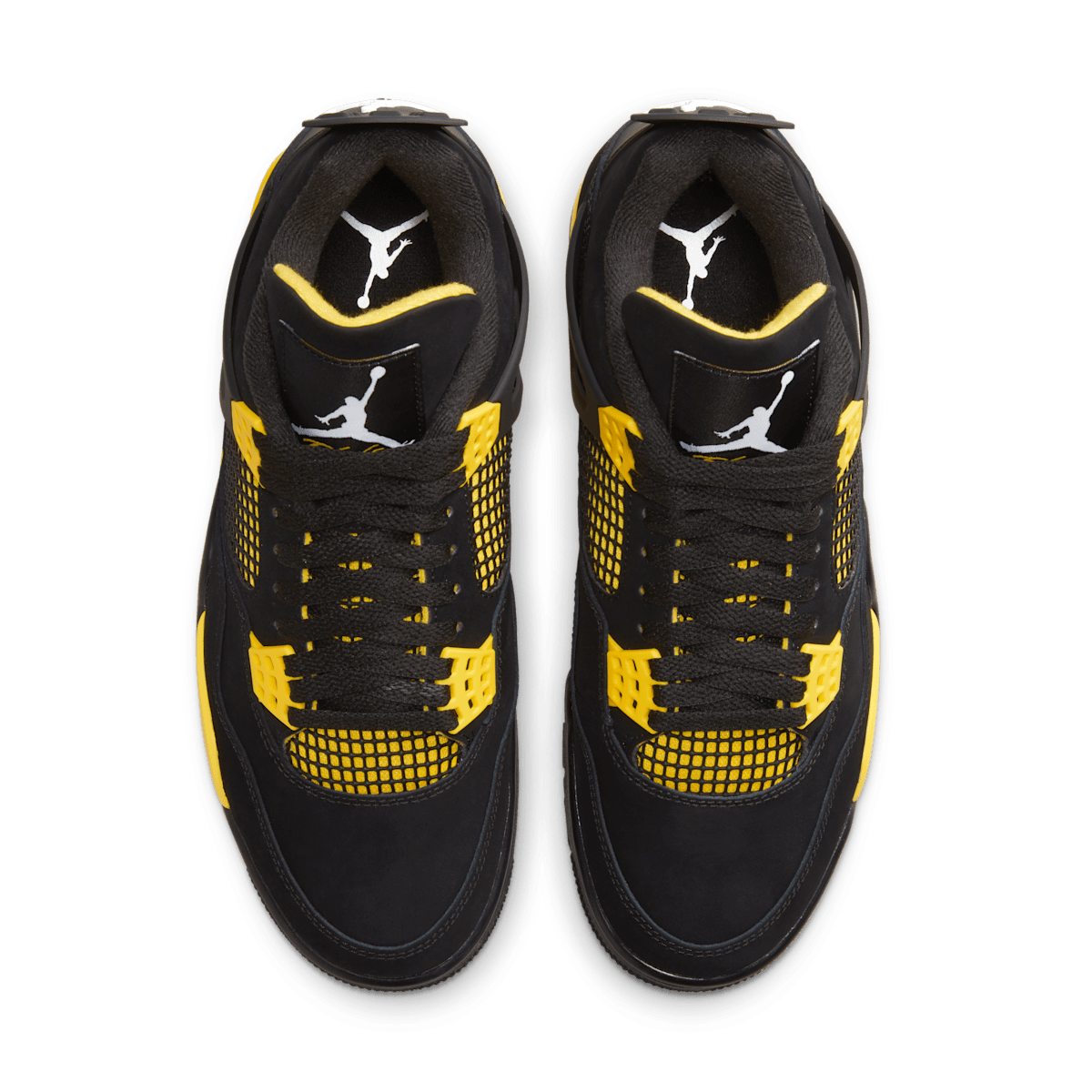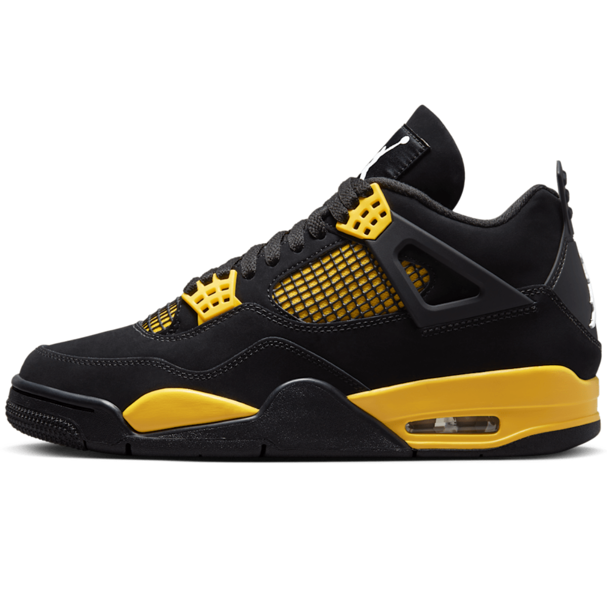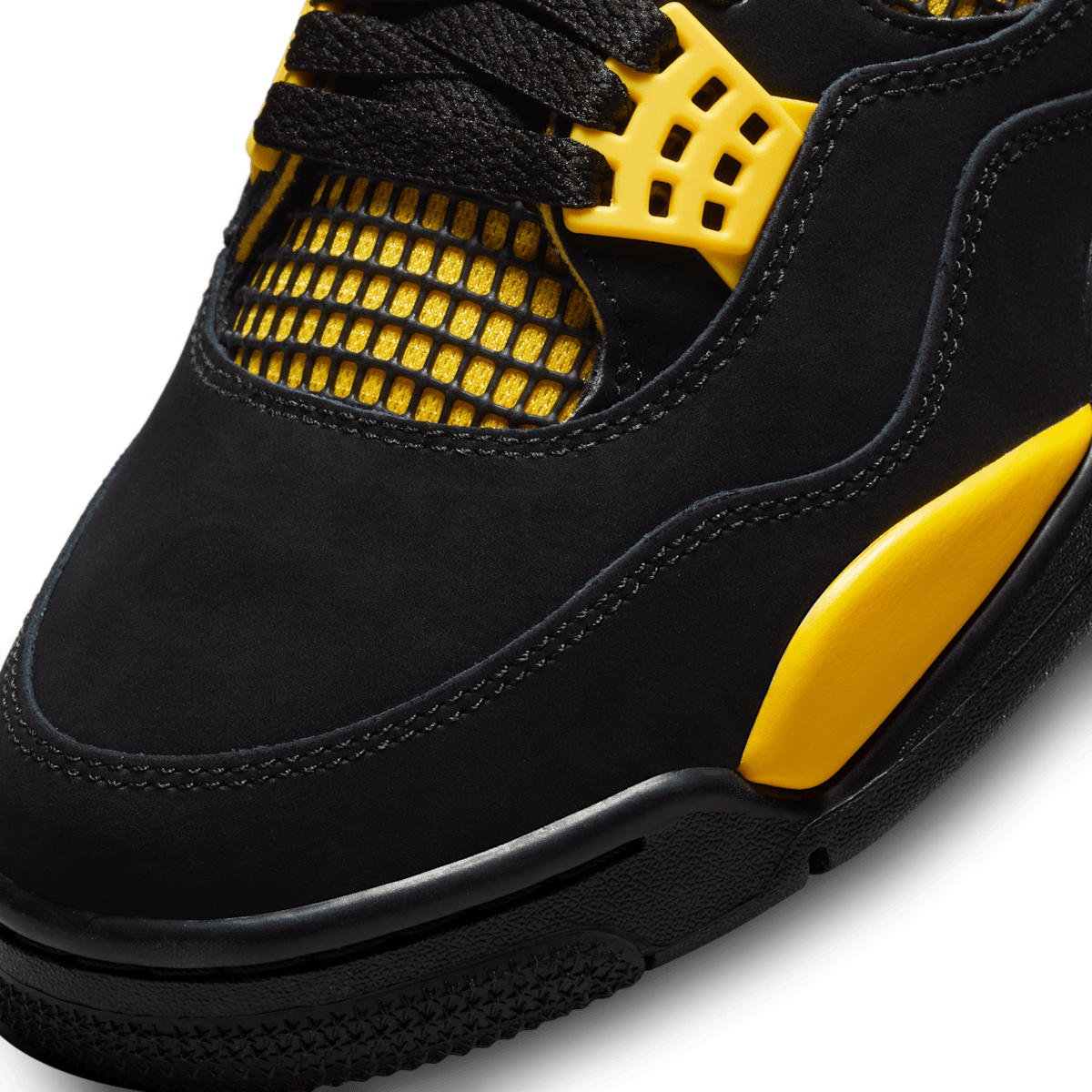The 2023 edition of the Air Jordan 4 Retro ‘Thunder’ brings back the coveted colorway originally released in 2006 (and previously reissued in 2012). The upper is draped in smooth black nubuck, contrasted by hits of yellow on the molded eyelets, quarter panel, and lower tongue, with the latter two components covered in black netting. Jumpman branding appears on the Flight tongue tag and molded heel tab. Lightweight cushioning comes courtesy of a yellow polyurethane midsole, enhanced with an exposed Air-sole unit in the heel.