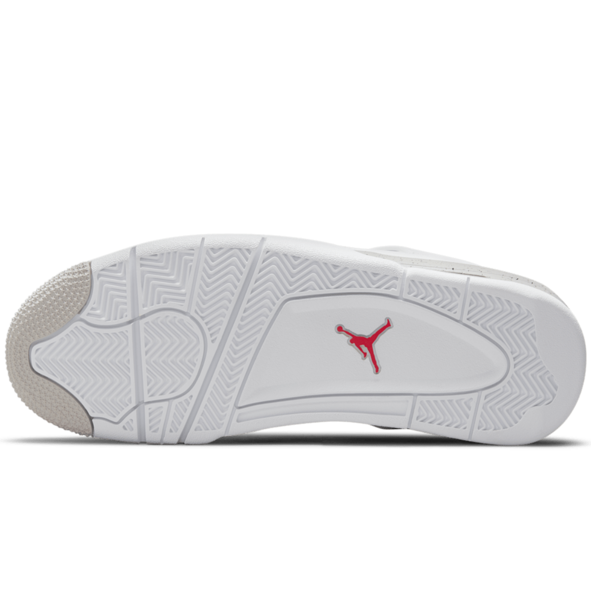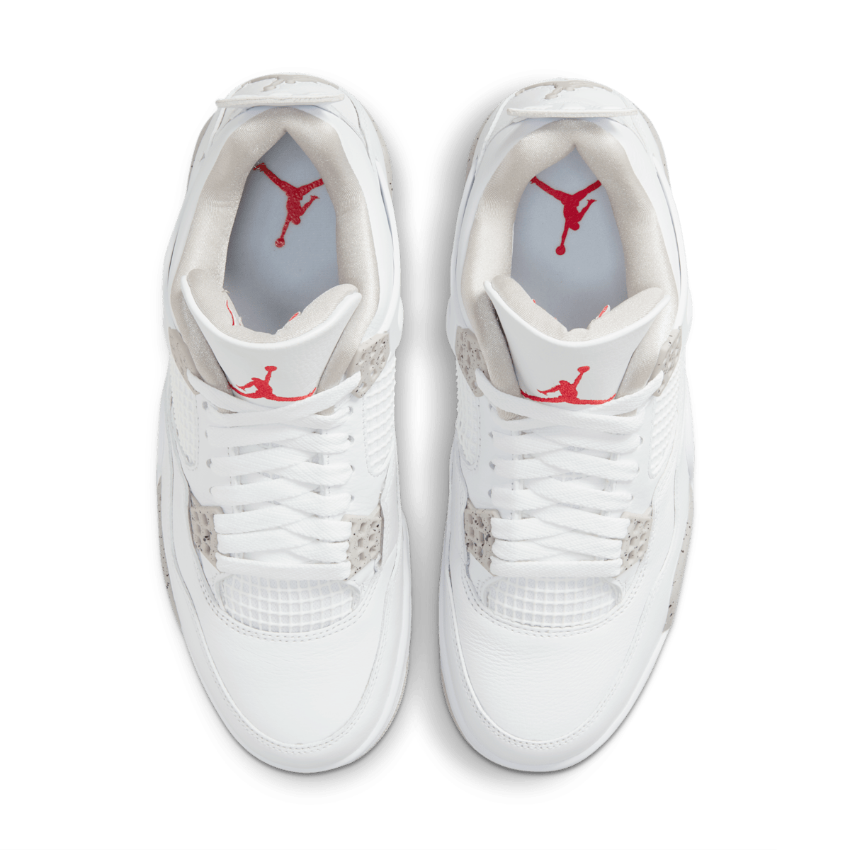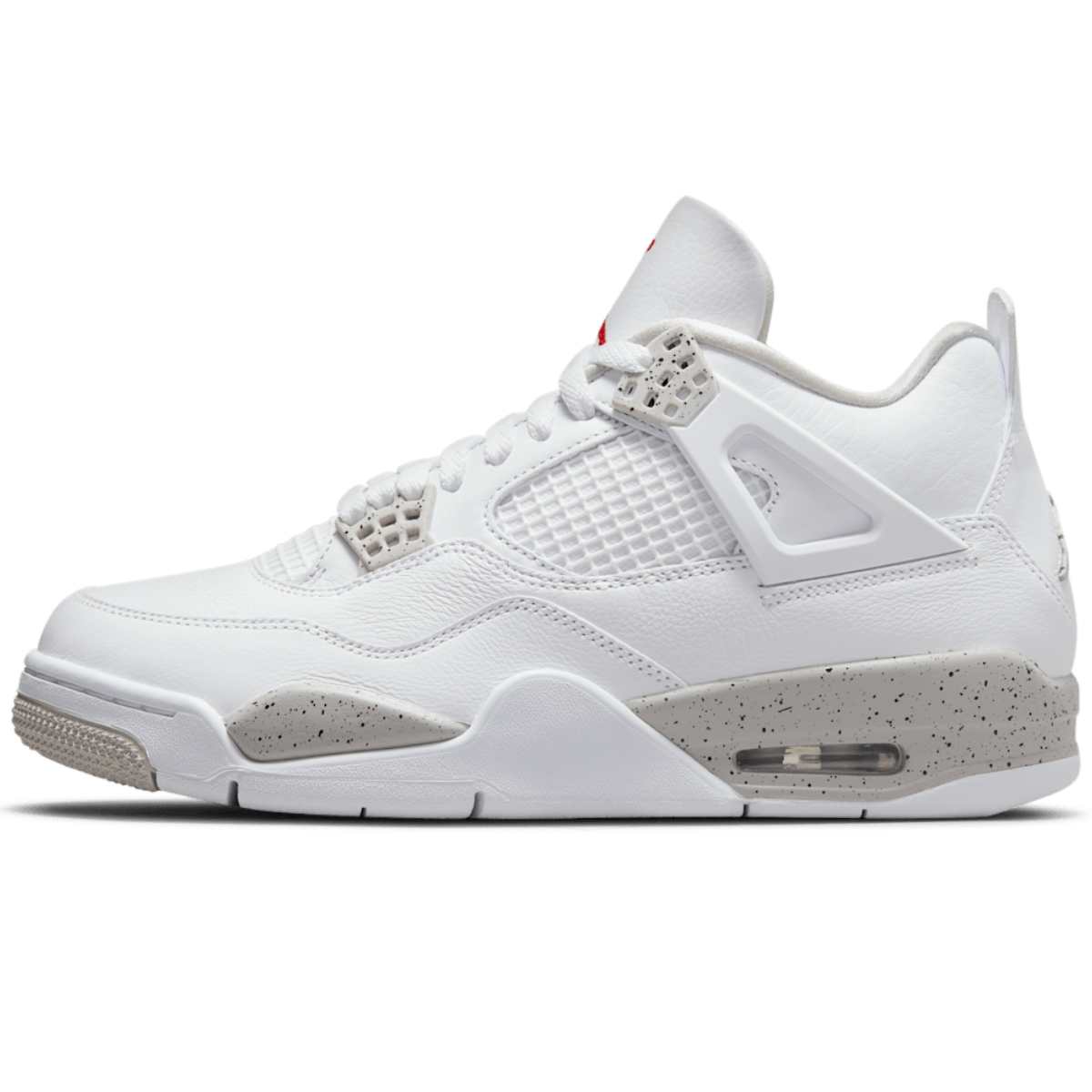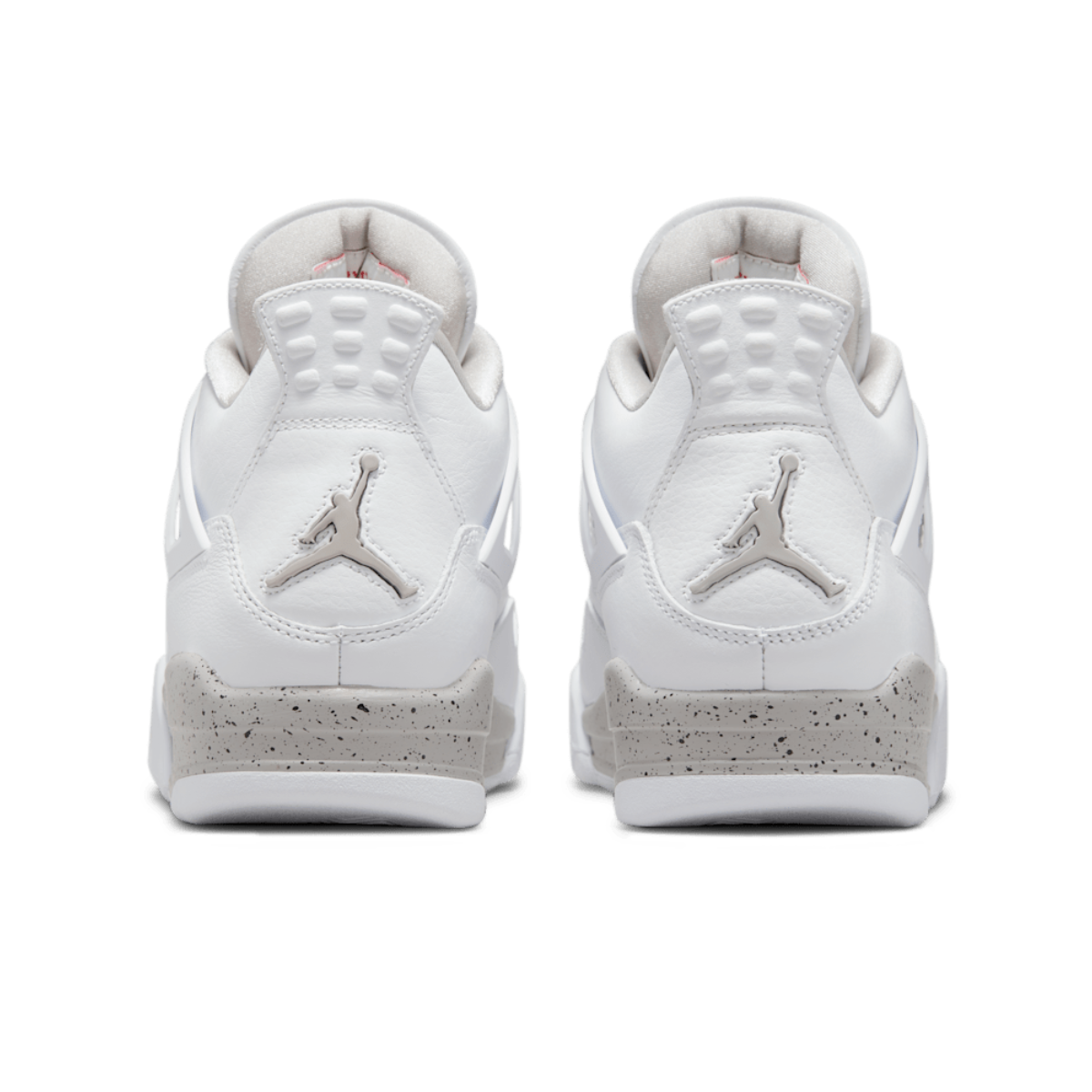 The Air Jordan 4 Retro ‘White Oreo’ features a design theme that recalls the original ‘Oreo’ AJ4 from 1999. The black tumbled leather upper of the older shoe is replaced by a clean white finish, though the speckled molded eyelets in Tech Grey remain the same. The neutral hue is repeated on the Jumpman heel logo and polyurethane midsole, featuring encapsulated Air cushioning in the forefoot and a visible unit under the heel. A second Jumpman adorns the tongue in a contrasting pop of Fire Red.