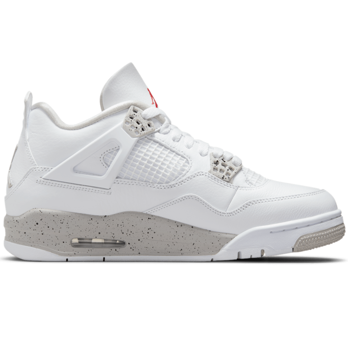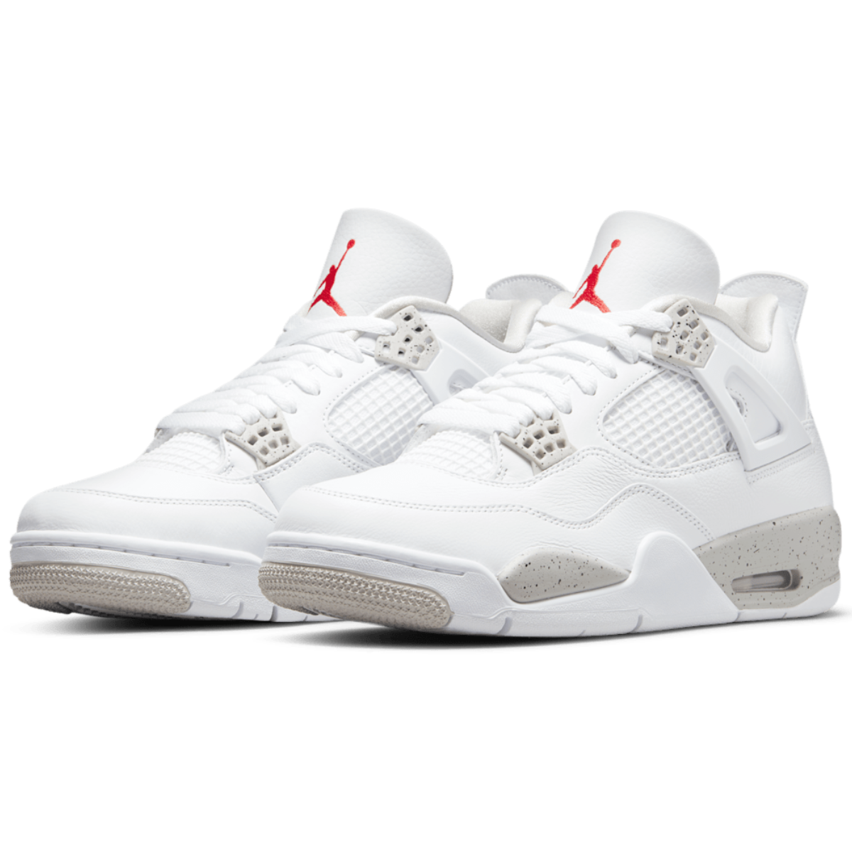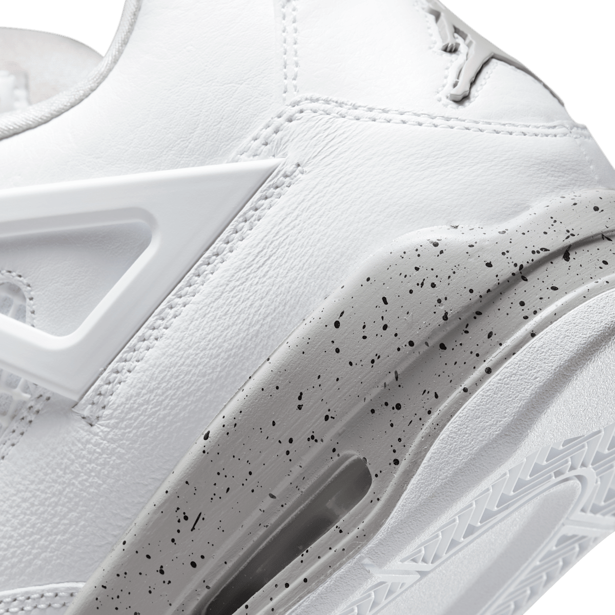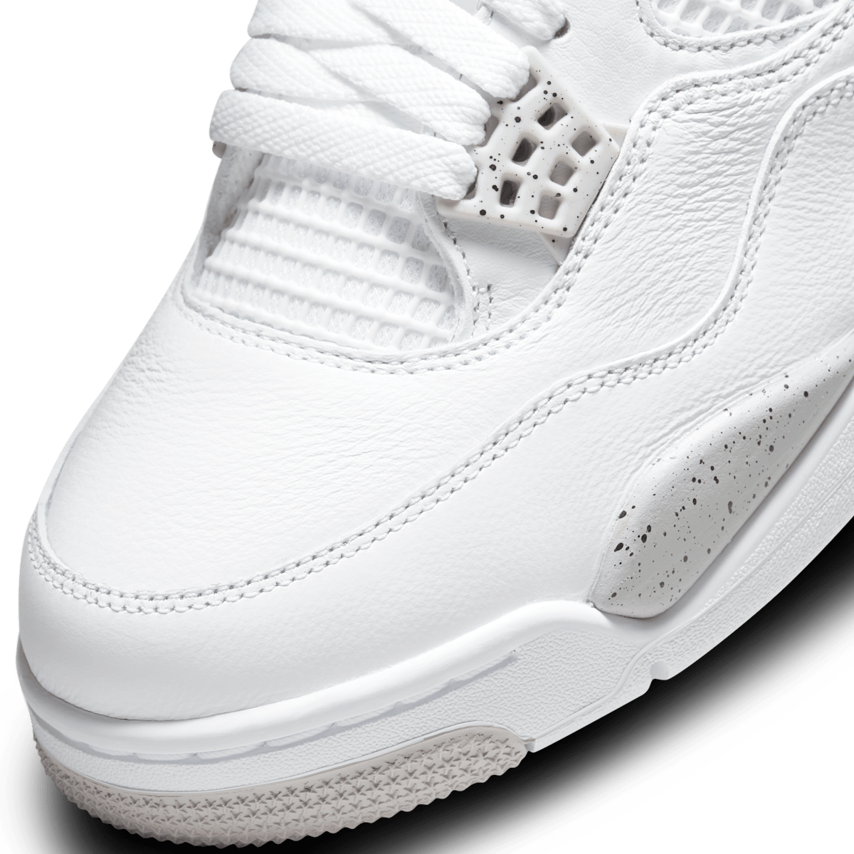 The Air Jordan 4 Retro ‘White Oreo’ features a design theme that recalls the original ‘Oreo’ AJ4 from 1999. The black tumbled leather upper of the older shoe is replaced by a clean white finish, though the speckled molded eyelets in Tech Grey remain the same. The neutral hue is repeated on the Jumpman heel logo and polyurethane midsole, featuring encapsulated Air cushioning in the forefoot and a visible unit under the heel. A second Jumpman adorns the tongue in a contrasting pop of Fire Red.