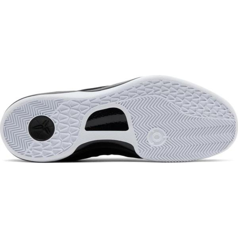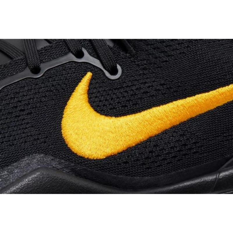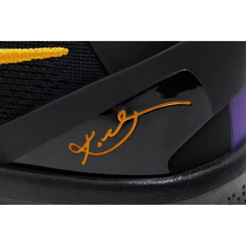 The Nike Kobe 8 Protro 'Lakers Away' features a black engineered mesh upper with tonal no-sew overlays and a gold embroidered Swoosh. Kobe Bryant's sheath logo graces the tongue and back heel in Court Purple. Lightweight cushioning is provided by a drop-in React foam midsole, replacing the Lunarlon foam of the original Kobe 8. Underfoot, the herringbone-traction rubber outsole reveals a bottom-loaded carbon fiber shank plate for midfoot stability.