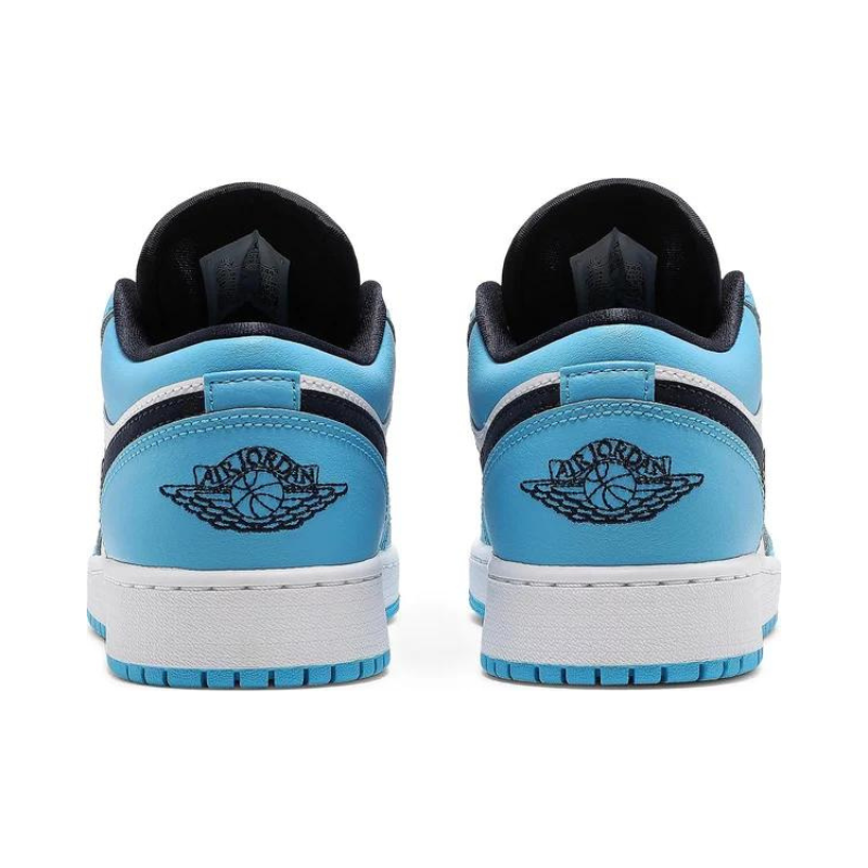 The Air Jordan 1 Low UNC 2021 for grade schoolers (GS) arrives with a white leather upper with University Blue overlays and obsidian Swoosh. The Air Jordan 1 Low UNC 2021 (GS) features a white leather base with University Blue overlays. Several navy-blue accents on the laces, Wings, and tongue provide a slight contrast to the overall look. There is a University Blue Jumpman on the tongue and a navy-blue embroidered Jordan Wings on the heel. Underfoot, a clean white midsole and University Blue outsole finish the design.
